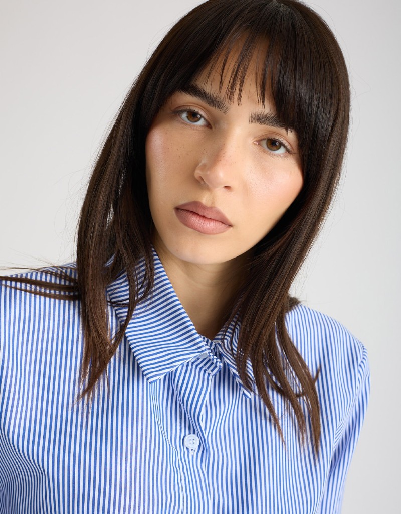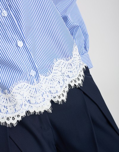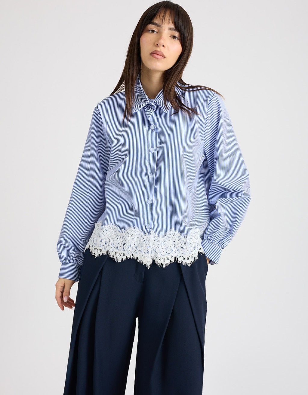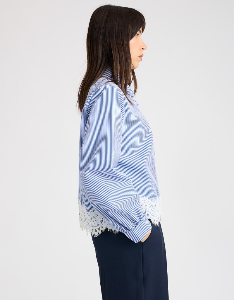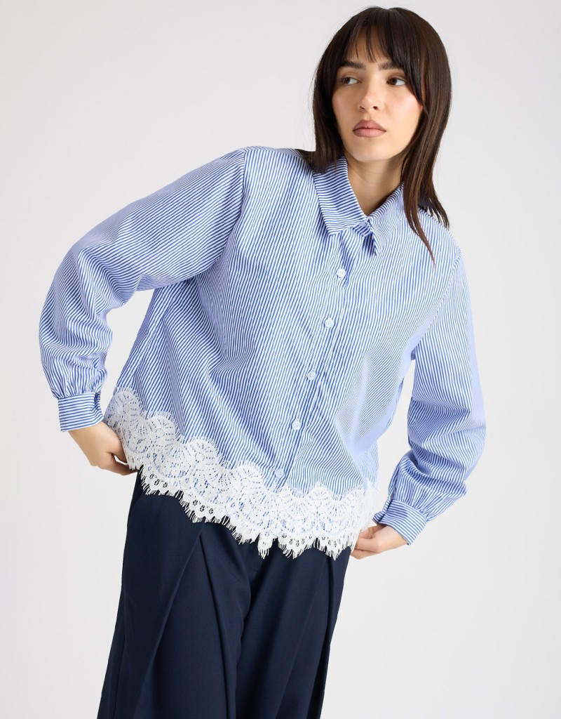 Camicia in tessuto leggero a righe, dal taglio comodo che accompagna la silhouette senza segnare. Il dettaglio in pizzo sul fondo aggiunge un tocco femminile e raffinato, rendendo il capo perfetto per giornate di lavoro o incontri informali in primavera. Fresca e versatile, porta eleganza anche agli outfit più semplici.