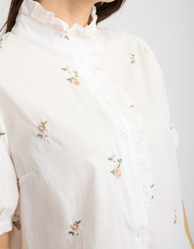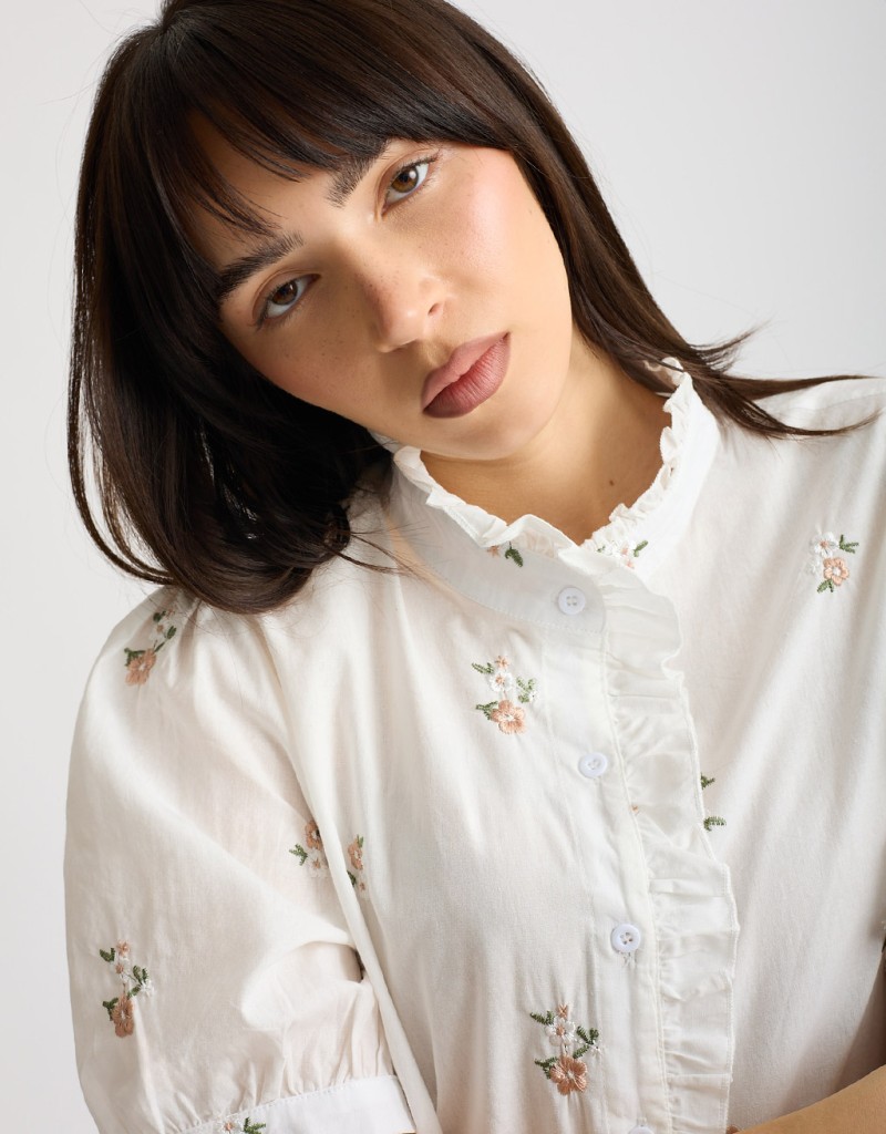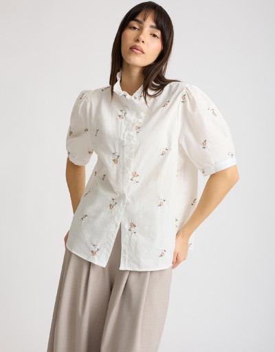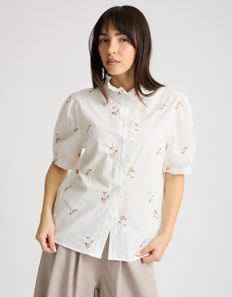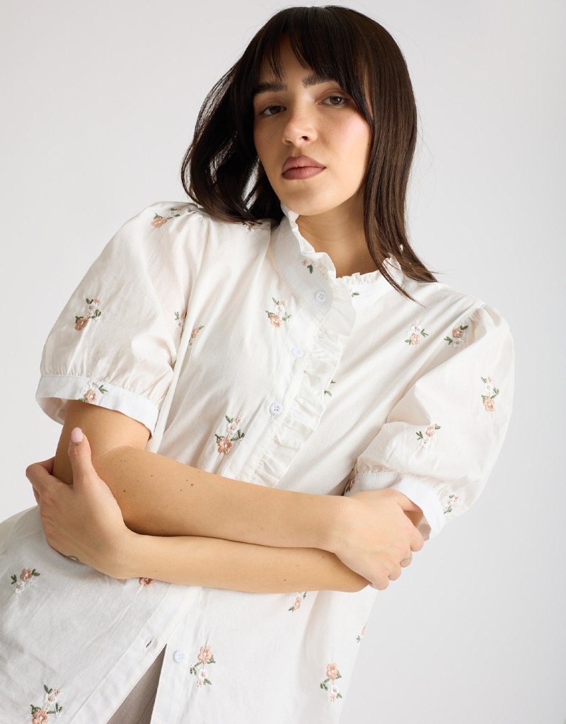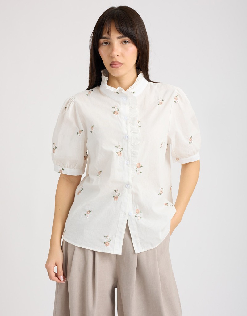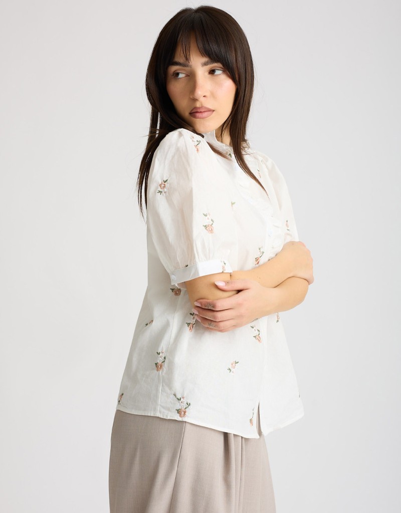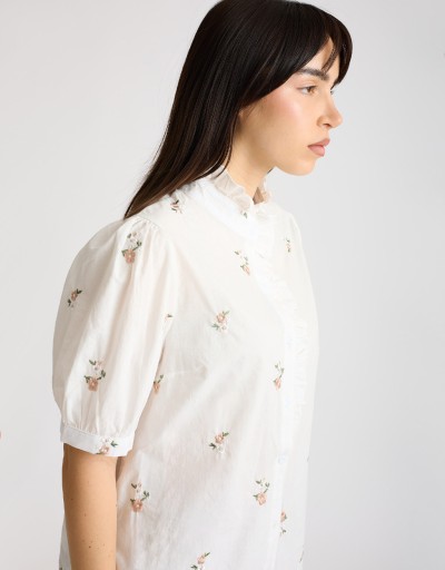 Camicia in cotone fresco e leggero, con maniche corte e collo alla coreana. Le rouches sul collo e sulla scollatura aggiungono un tocco romantico e sofisticato, mentre i delicati fiori ricamati su tutta la superficie rendono il capo unico e femminile. Perfetta per le giornate miti di primavera, dona un’allure raffinata anche agli outfit più casual.