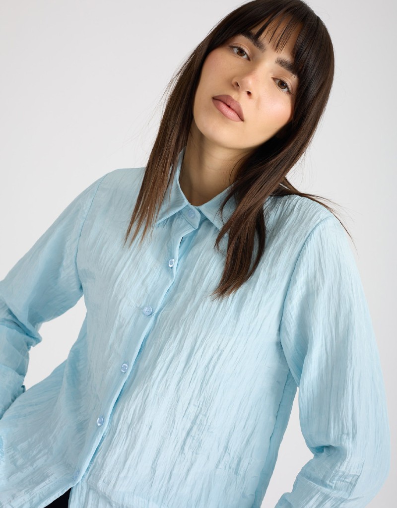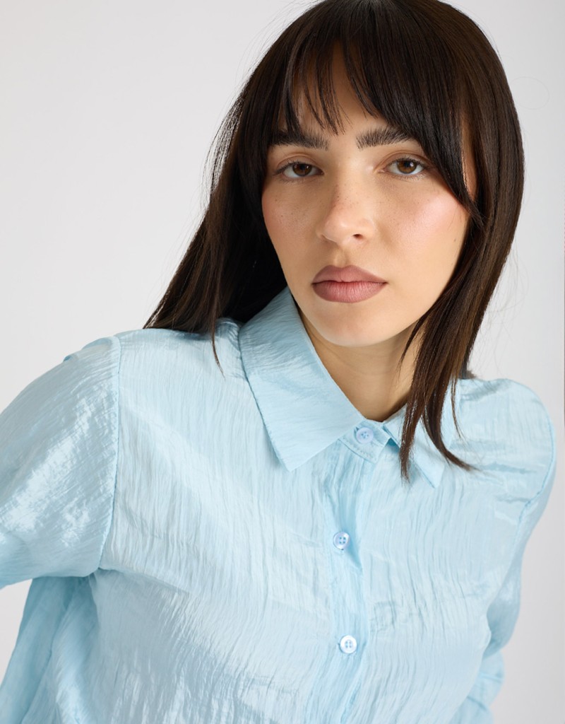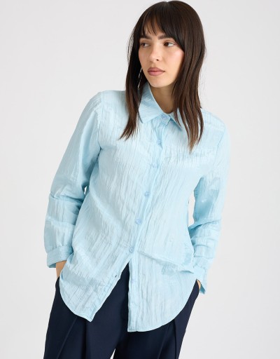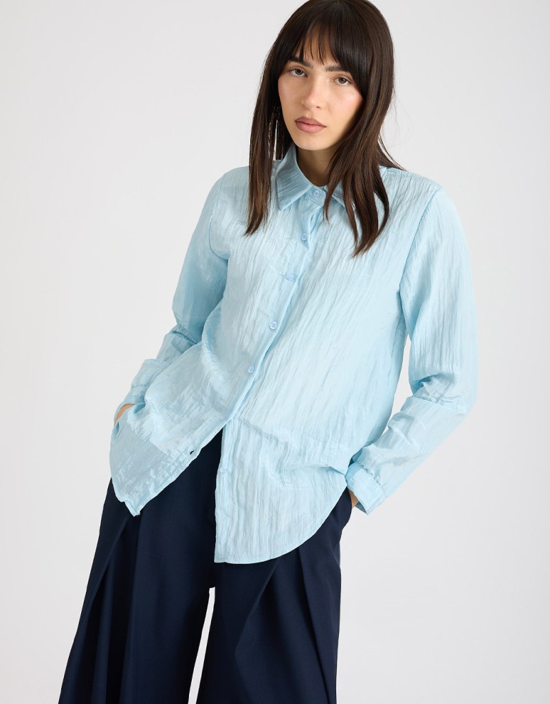 Camicia in tessuto leggero dall’effetto lucido stropicciato, dal taglio morbido che scivola sulla silhouette con naturalezza. Un capo versatile e raffinato, perfetto per aggiungere un tocco di luminosità agli outfit primaverili o per serate informali, senza rinunciare al comfort.
