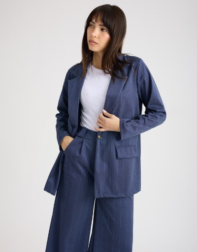 Blazer in tessuto fresco, leggero ed elasticizzato dalla fantasia gessata/spinata, con collo a revers e chiusura frontale a un bottone. Dal taglio morbido ma strutturato, dona subito un’allure raffinata e versatile. Un capo elegante che valorizza la silhouette senza rinunciare al comfort.