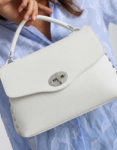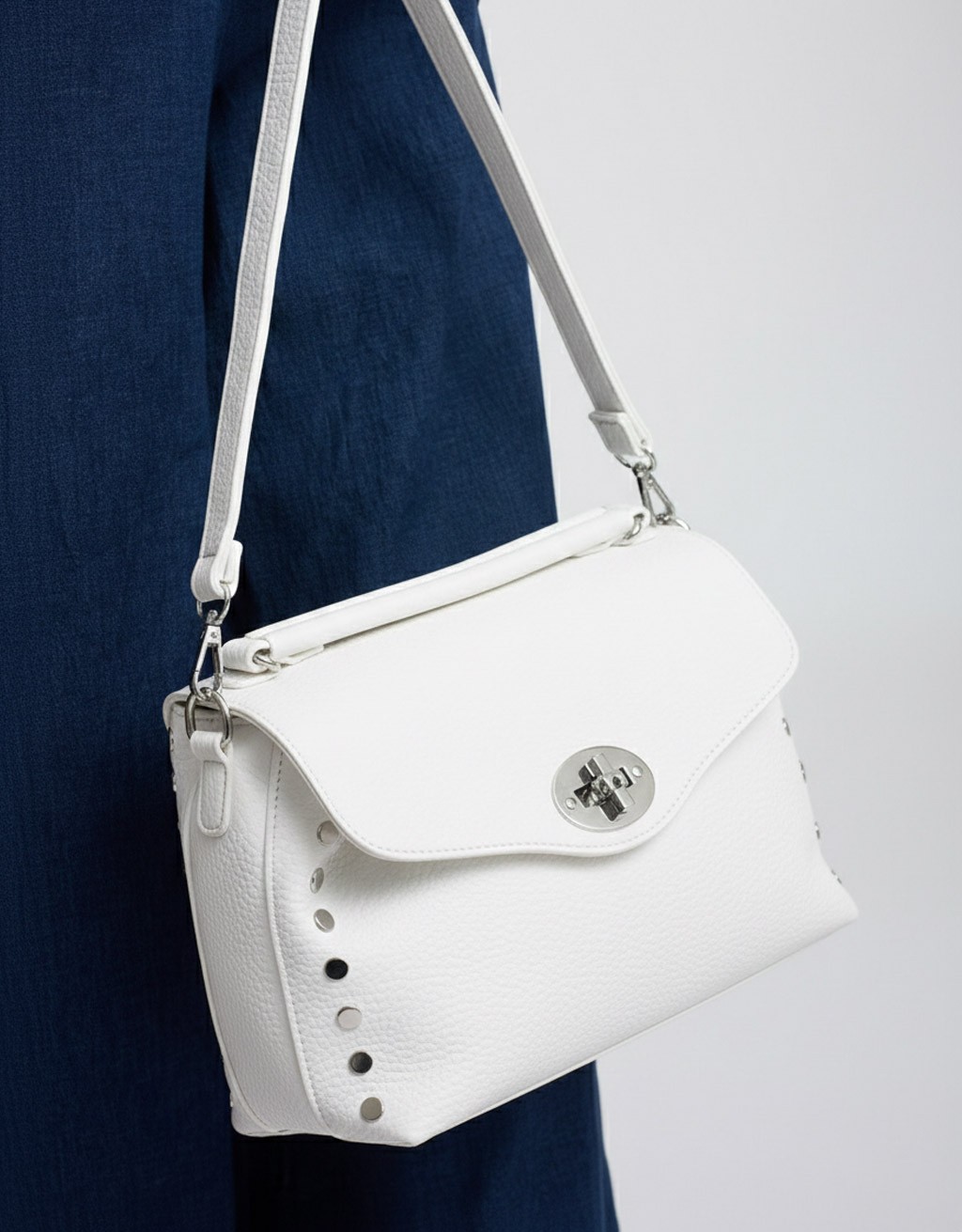 (Ogni 1,00 € speso = 1 punto)Elegante borsa a tracolla con patta frontale e contorno decorato da borchie metalliche, che aggiungono un tocco grintoso e moderno al design. Perfetta per completare look casual o serali.