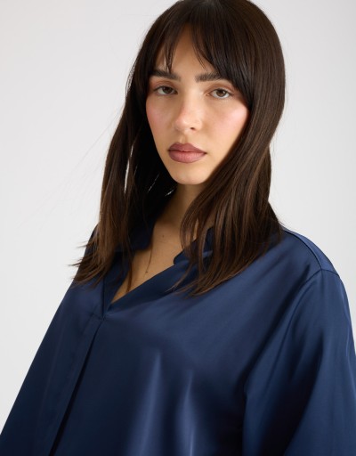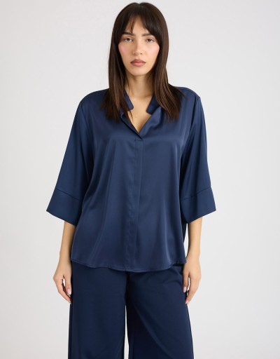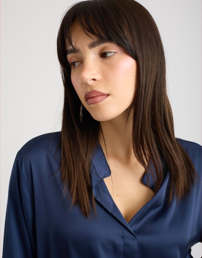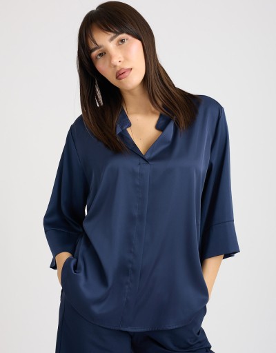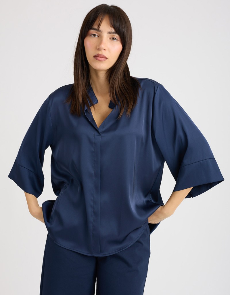 Blusa dal taglio over realizzata in tessuto fresco e leggero effetto raso, perfetta per donare luce e movimento al look. Il collo alla coreana con scollatura a V valorizza il décolleté con eleganza, mentre la pince frontale e il fondo leggermente più lungo dietro creano una linea fluida e contemporanea. Ideale per affrontare con stile le giornate lavorative e gli impegni quotidiani della stagione.