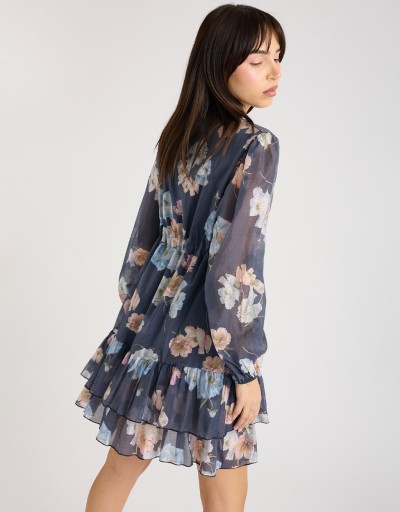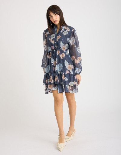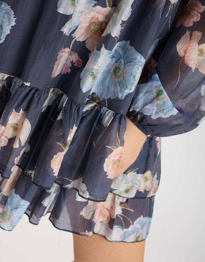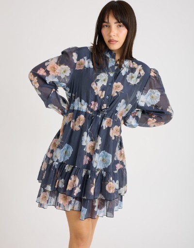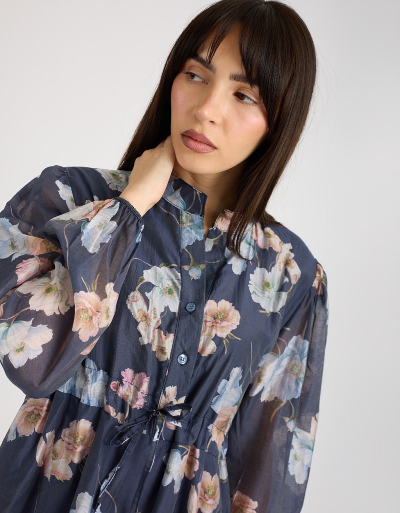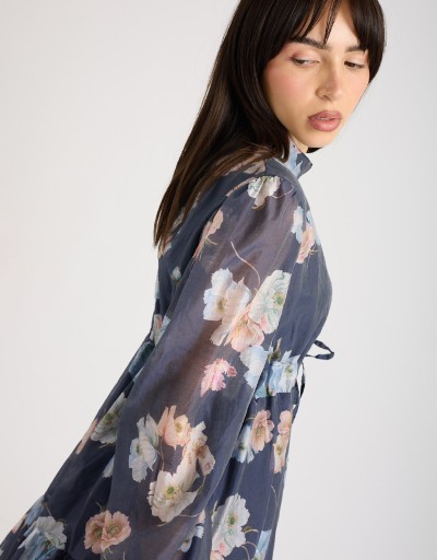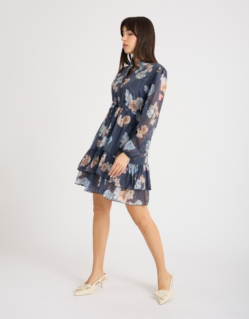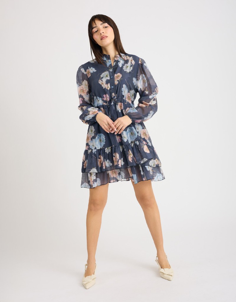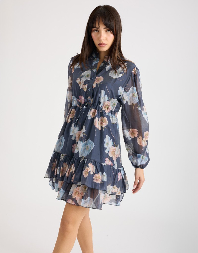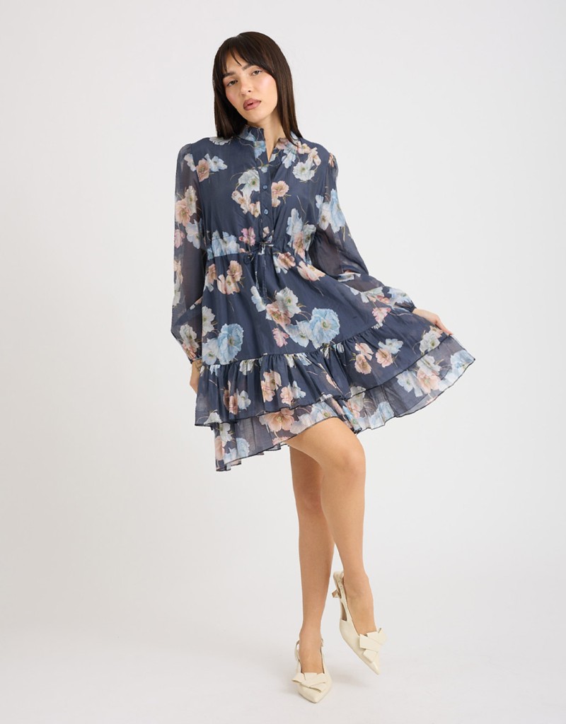 Abito corto in lyocell fantasia floreale, leggero e fresco, perfetto per la primavera e l’estate. Il collo alla coreana e la chiusura frontale con bottoni donano un tocco di raffinatezza, mentre il laccio regolabile in vita valorizza la silhouette. La gonna a doppio strato, con uno più lungo che crea una delicata balza, garantisce copertura e movimento, aggiungendo femminilità e leggerezza ad ogni passo.
