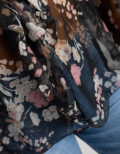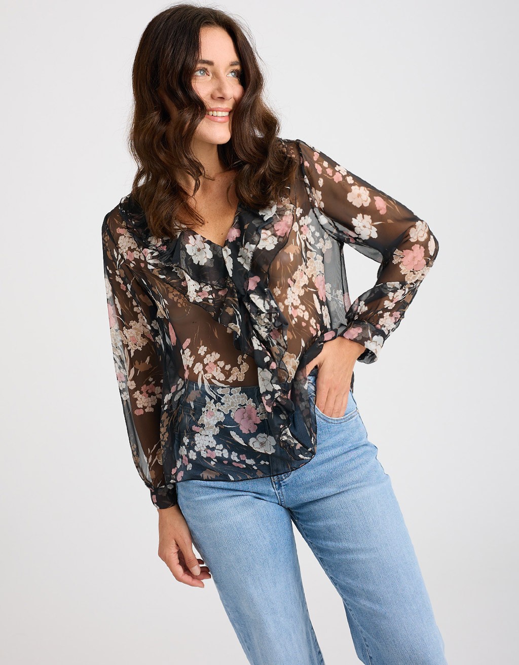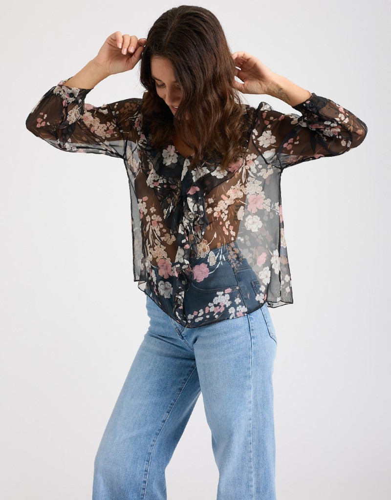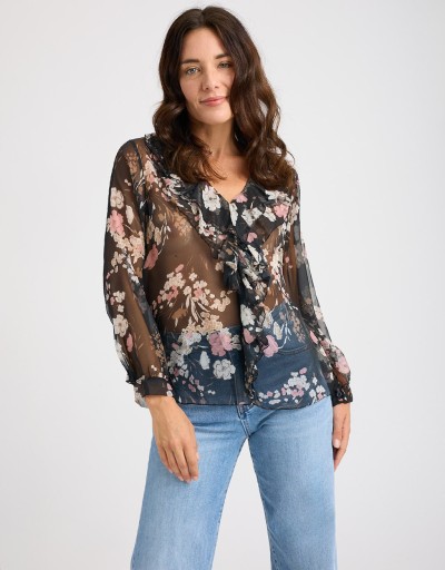 Camicetta in georgette fantasia, leggera e semitrasparente, perfetta per la primavera e l’estate. La scollatura a V e le rouches frontali donano un tocco femminile e romantico, rendendola versatile per outfit casual o più curati. Il tessuto fluido accompagna i movimenti con eleganza, ideale per giornate calde e look raffinati.