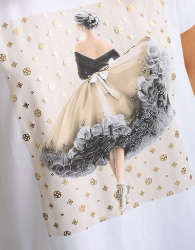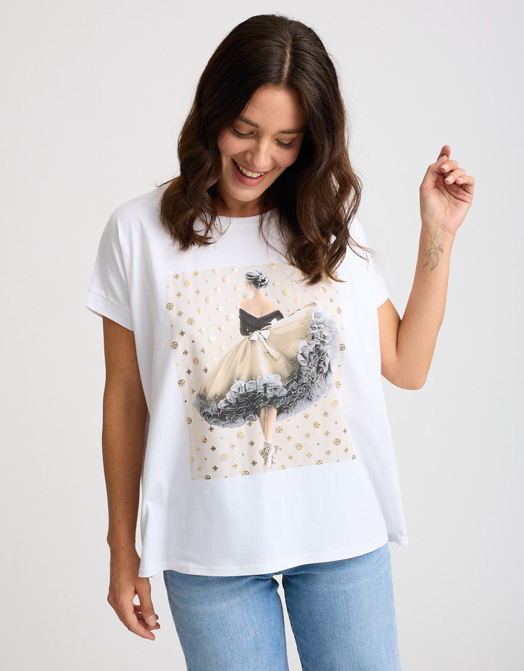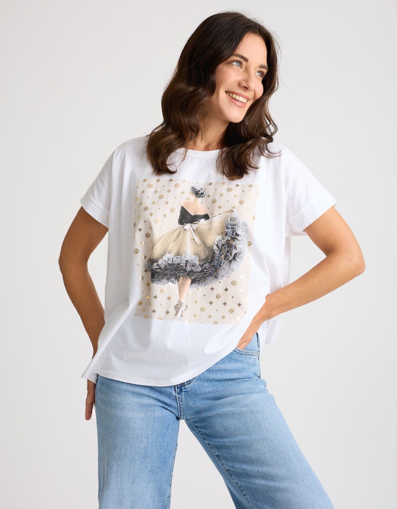 Perfetta con jeans cropped o pantaloni a gamba larga per un look casual quotidiano. Per un outfit più curato, indossala sotto una giacca leggera con sneakers o mocassini. Completa con accessori minimal per mantenere il focus sulla stampa.