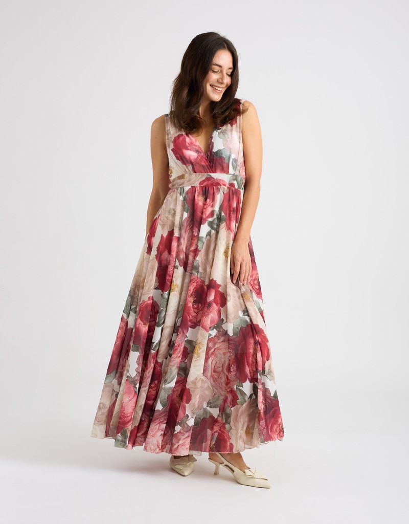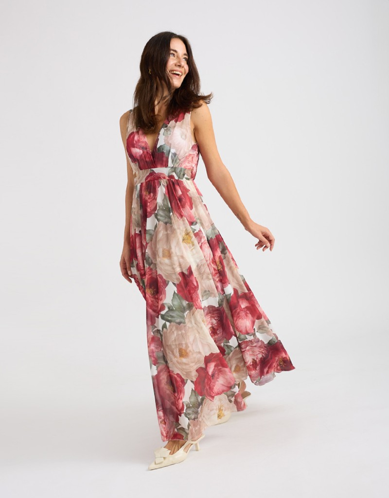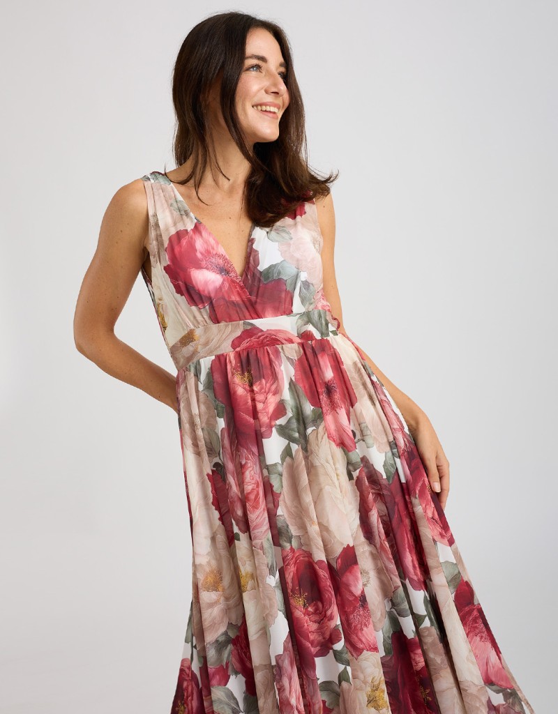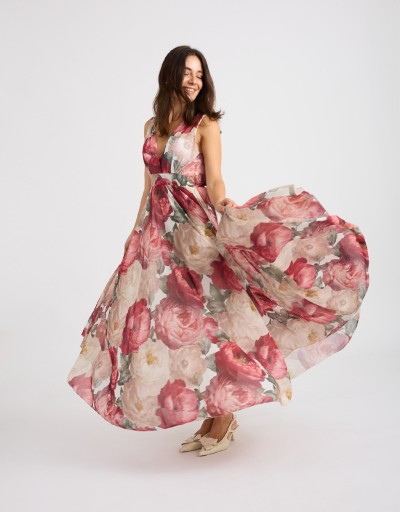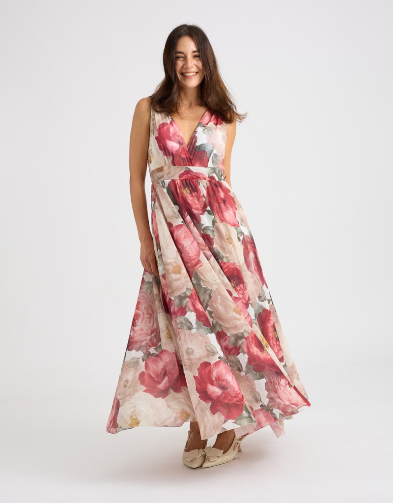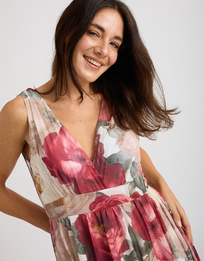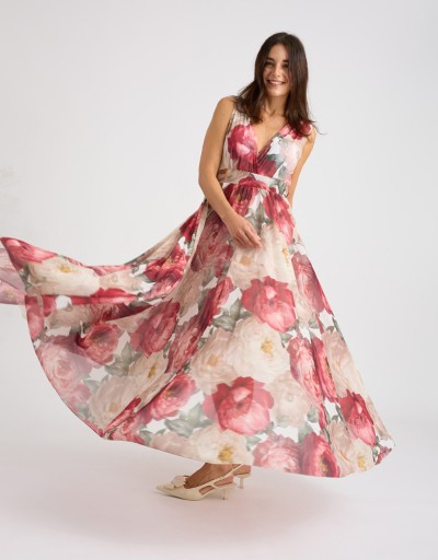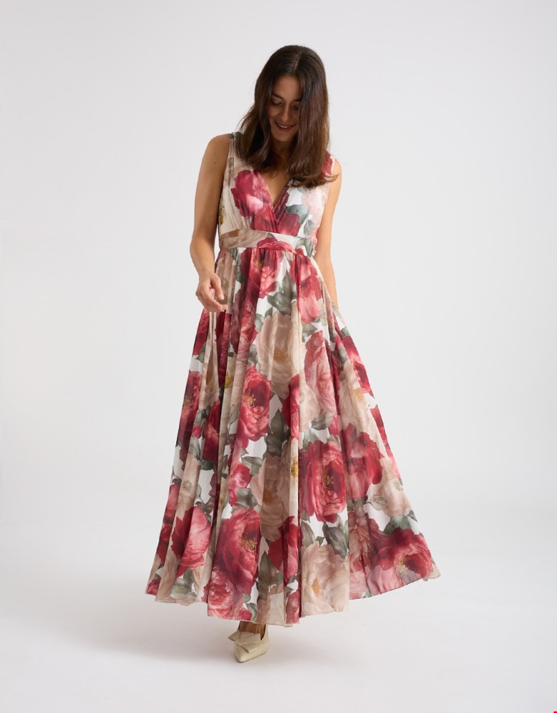 Abito lungo in georgette fantasia floreale, leggero e femminile, perfetto per le giornate primaverili ed estive. Lo stile impero valorizza la silhouette, mentre l’elastico dietro in vita adatta la vestibilità con comfort. La coppa imbottita e la fodera in viscosa assicurano sostegno e morbidezza sulla pelle, per un look elegante e naturale.