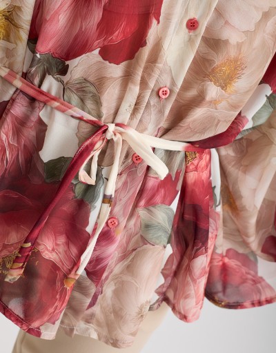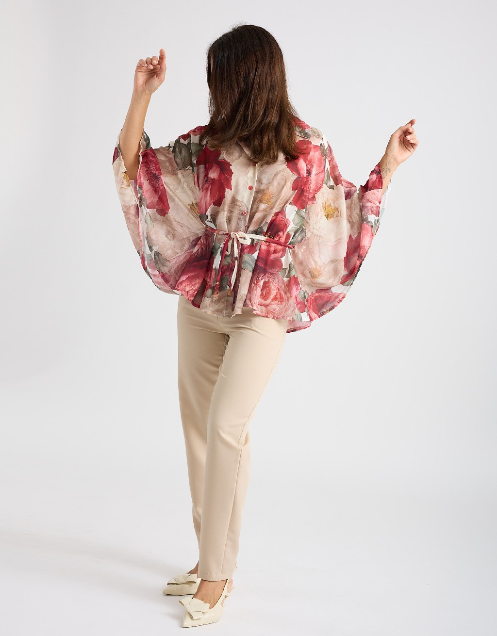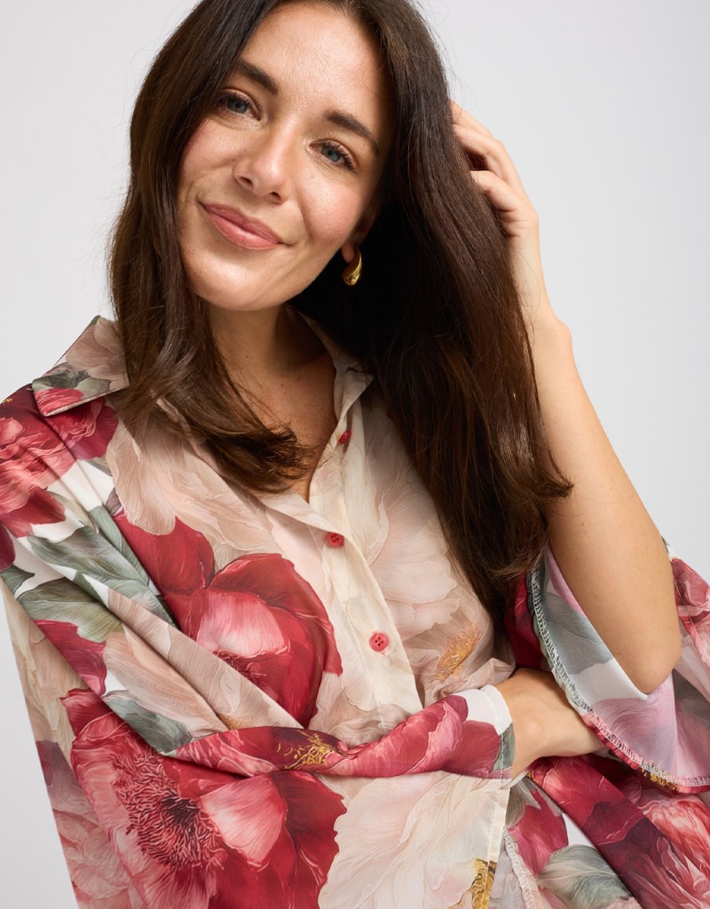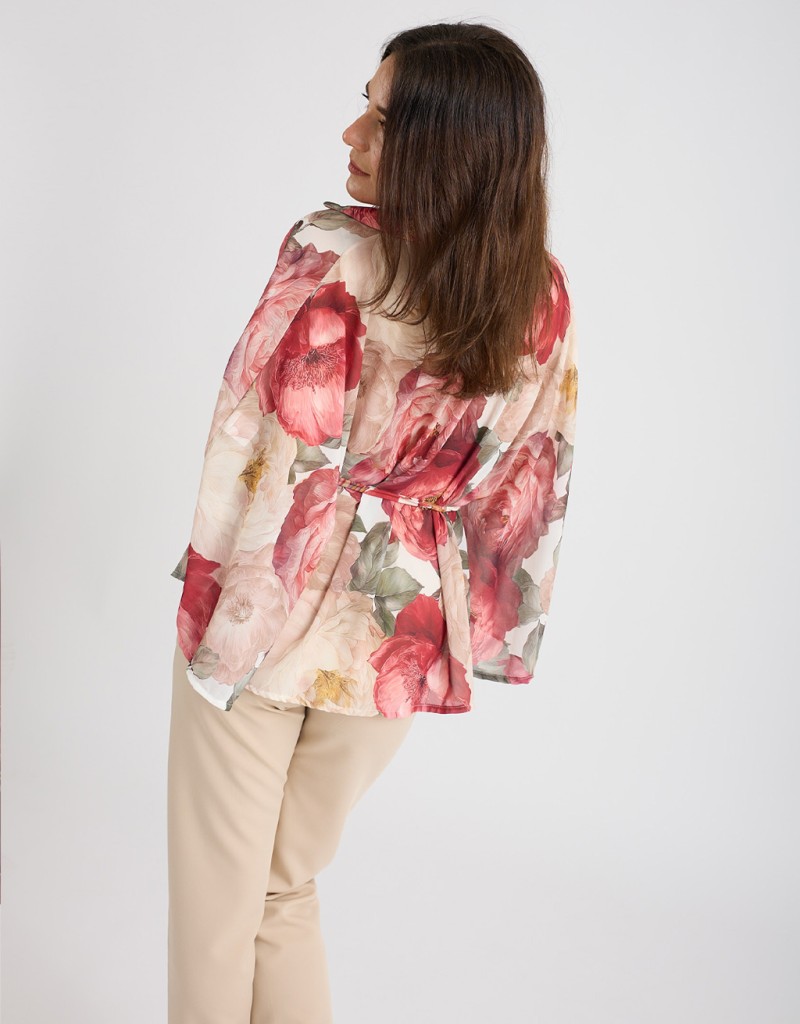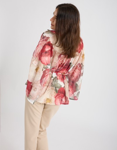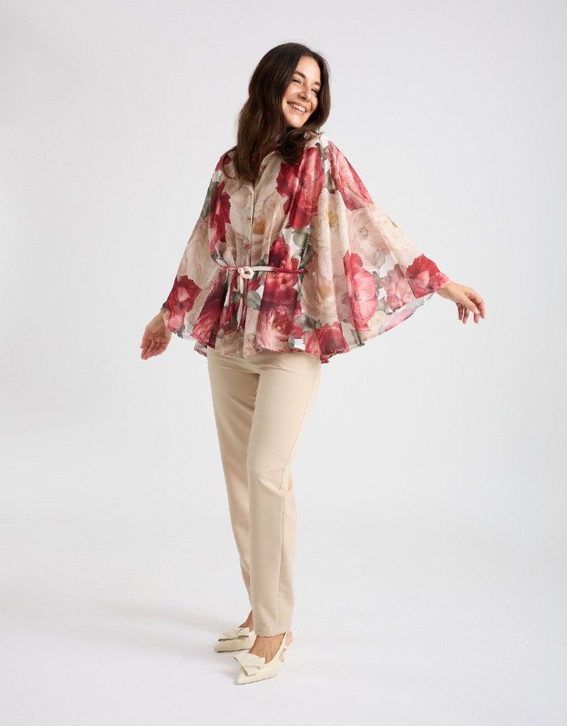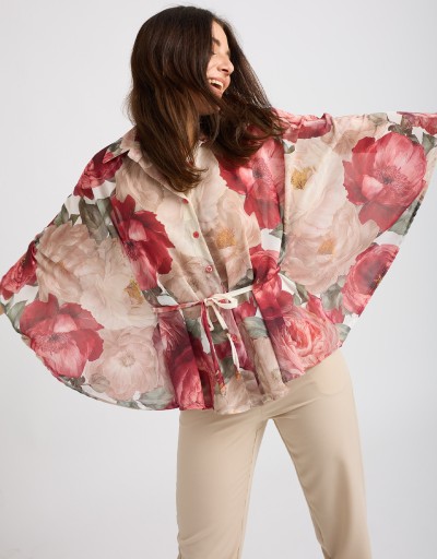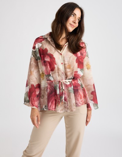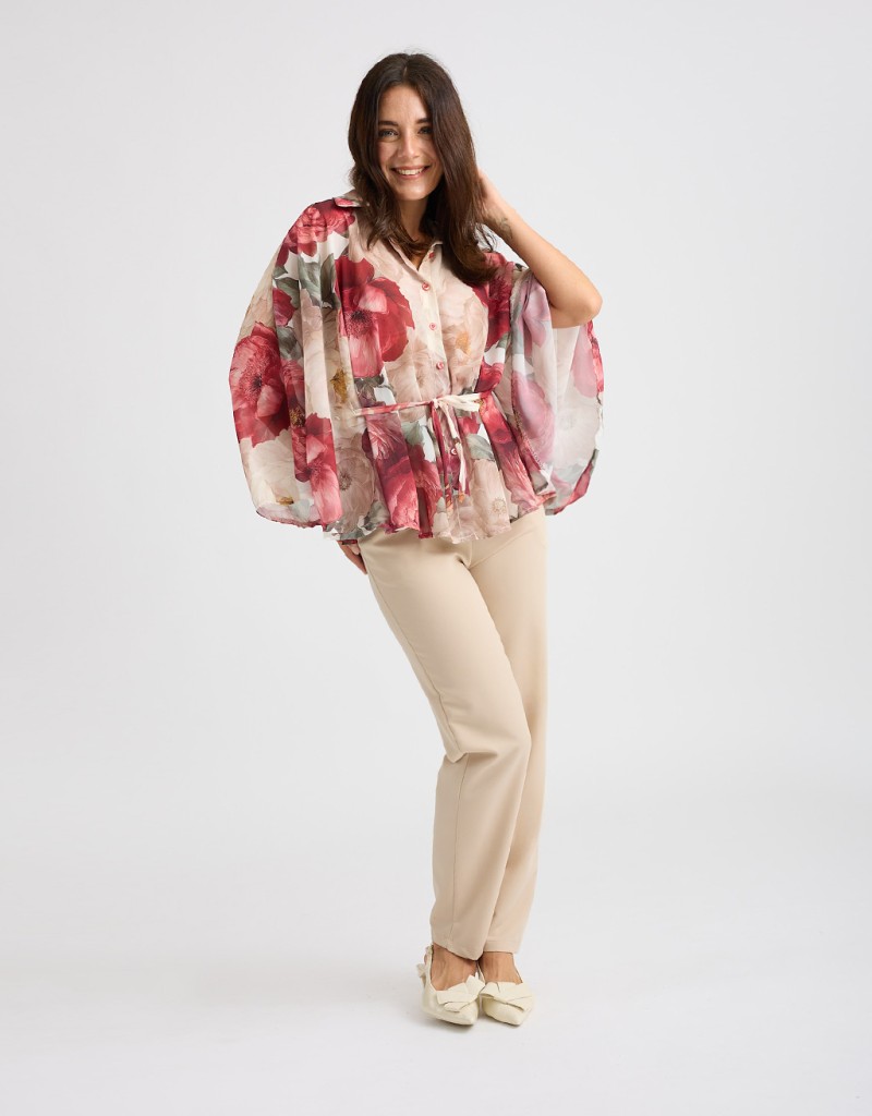 Camicia in georgette fantasia floreale dal fascino leggero e raffinato, modello a kimono che valorizza la silhouette con naturalezza. La chiusura frontale con bottoni e il laccio annodato in vita permettono di adattare il fit e creare look sia morbidi sia più definiti, perfetta per outfit casual chic o da ufficio.