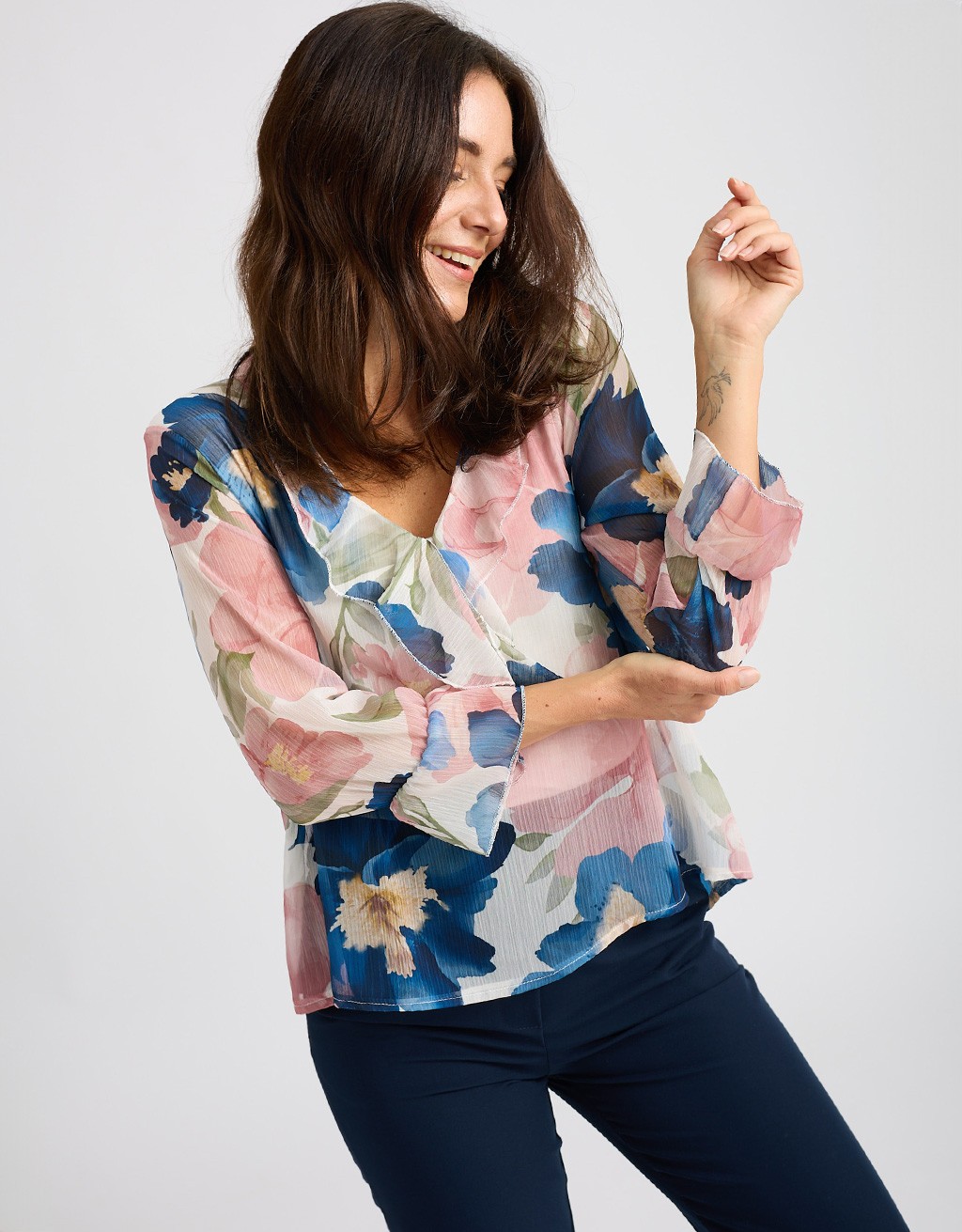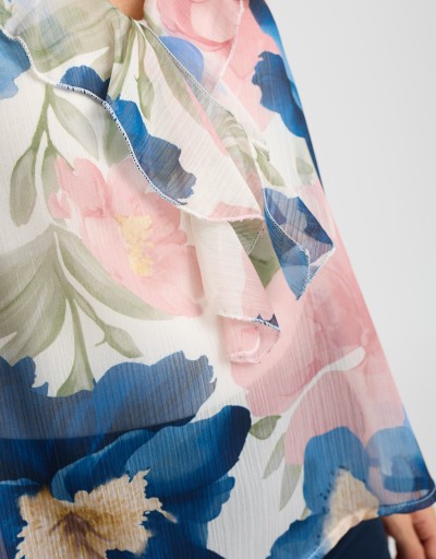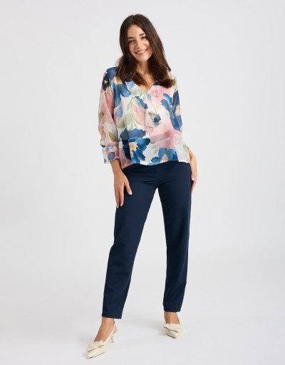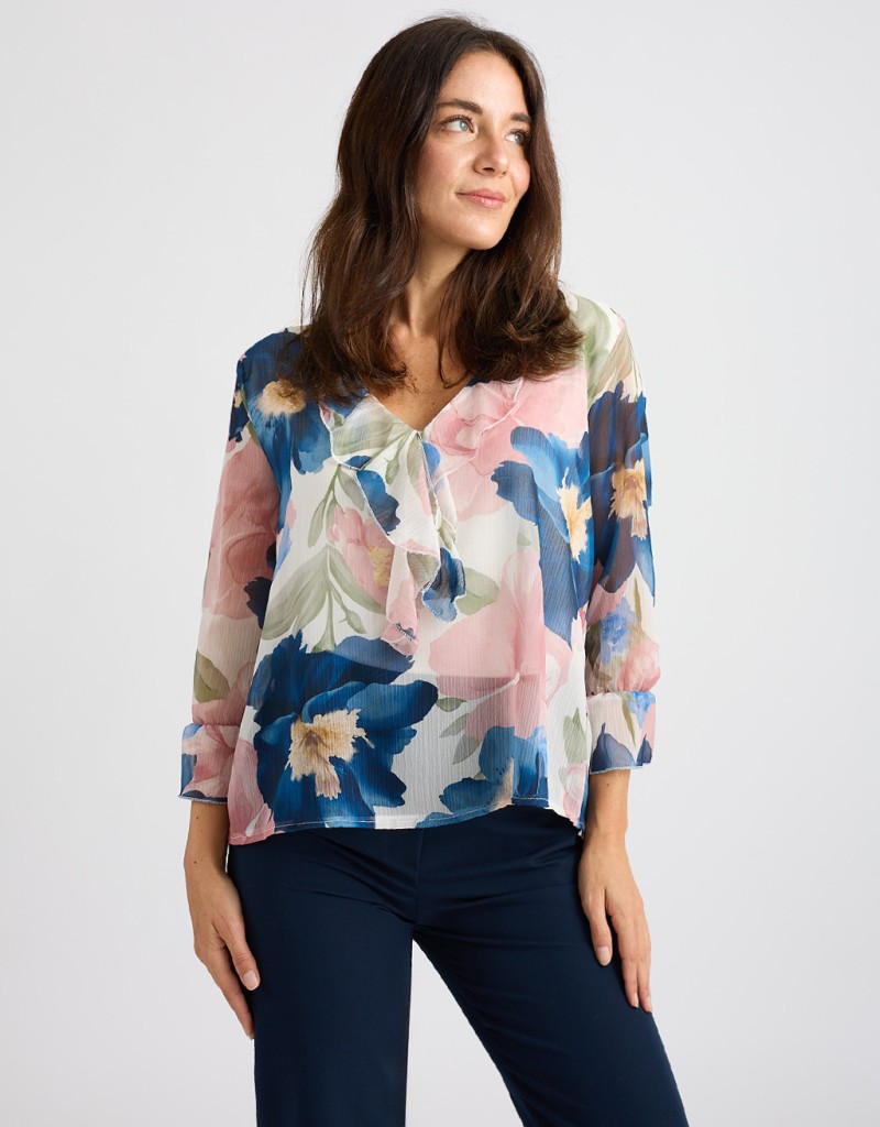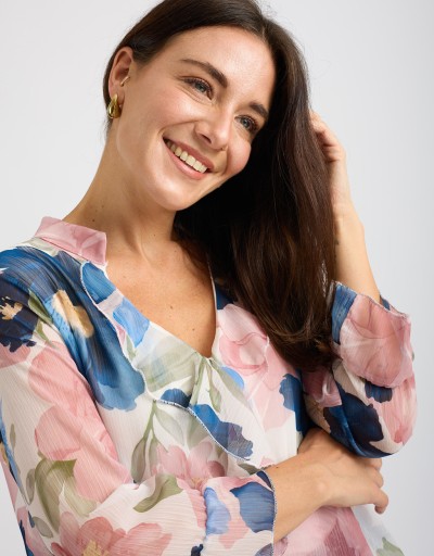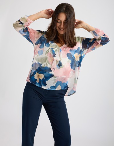 Femminile e raffinata, questa camicetta in georgette fantasia floreale è il capo ideale per dare luce ai look di stagione. Il collo alla coreana con scollatura a V e rouches valorizza il décolleté con delicatezza, mentre la vestibilità morbida accompagna le forme senza segnare. La fodera interna garantisce comfort e zero trasparenze: perfetta dall’ufficio all’aperitivo.