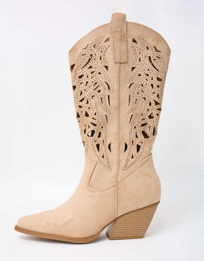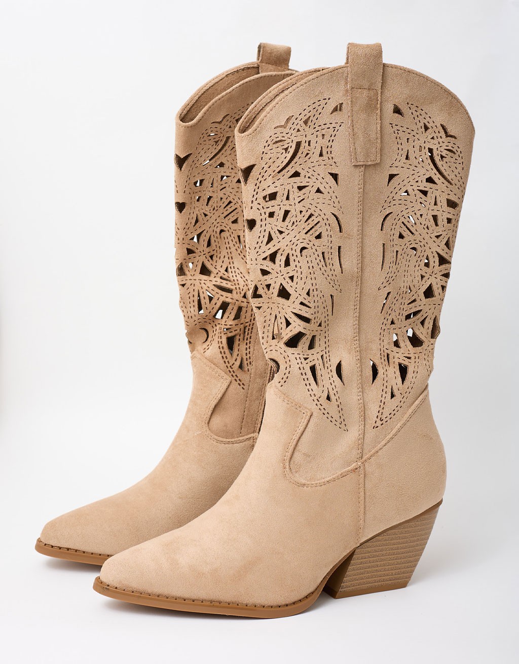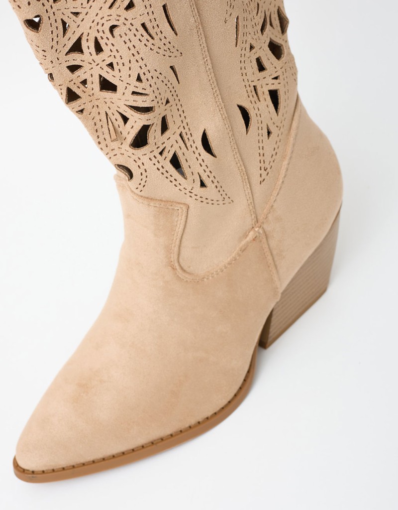 Stivale dallo stile western rivisitato in chiave femminile e moderna. Il gambale traforato con disegno decorativo dona leggerezza e carattere, mentre il colore marrone lo rende facile da abbinare e perfetto per la mezza stagione. Il tacco largo slancia la figura mantenendo comfort e stabilità, ideale per accompagnarti con stile nelle giornate dinamiche.