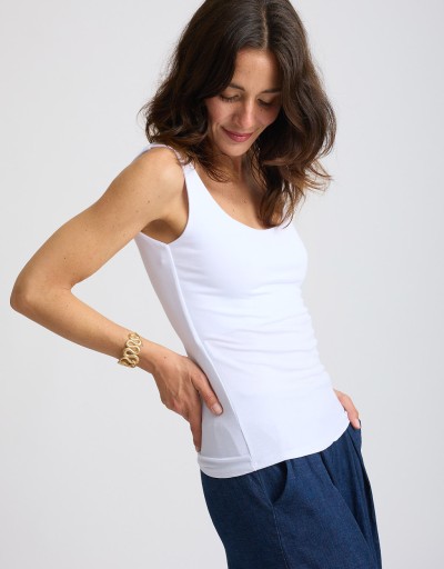 Canotta in viscosa elasticizzata a doppio strato, studiata per garantire completa copertura senza rinunciare alla leggerezza. Il modello slim valorizza la silhouette con una vestibilità aderente e femminile, rendendola un capo versatile e ideale per essere indossato sia da solo che sotto giacche e cardigan nelle stagioni intermedie.