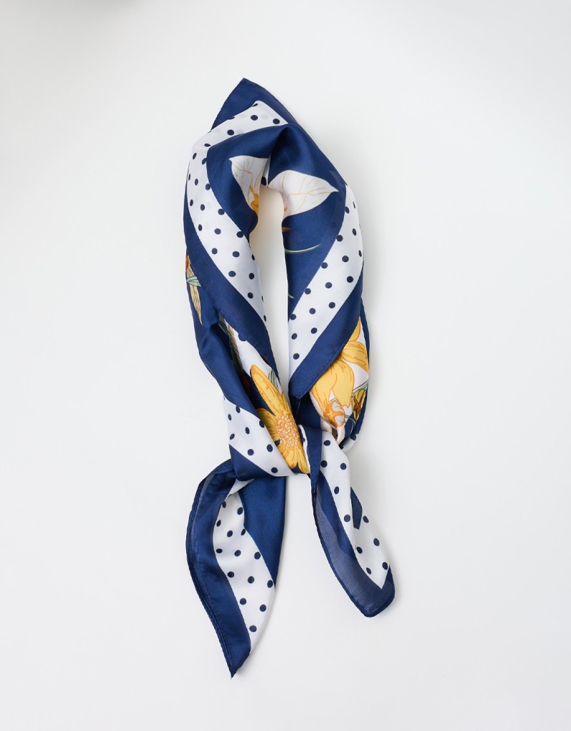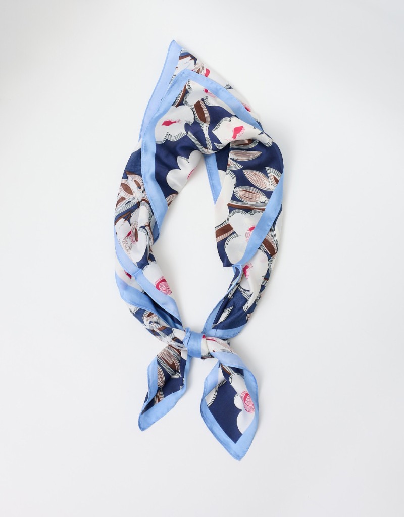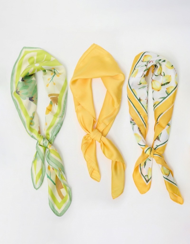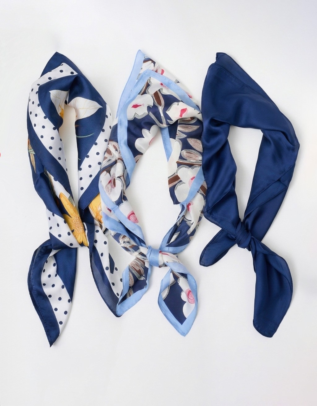 Il set è composto da tre foulard coordinati, tra cui uno a tinta unita e due in fantasia, ideali per creare abbinamenti diversi e adattarsi sia a look casual che più raffinati. Il tessuto leggero e morbido garantisce comfort durante tutta la giornata e una vestibilità fluida che permette di annodarli facilmente.