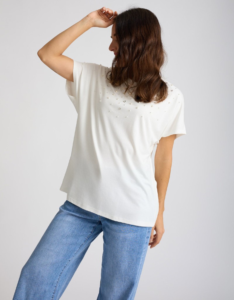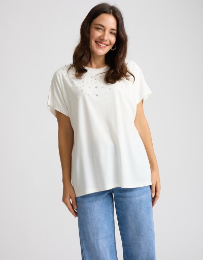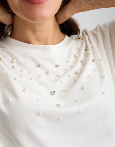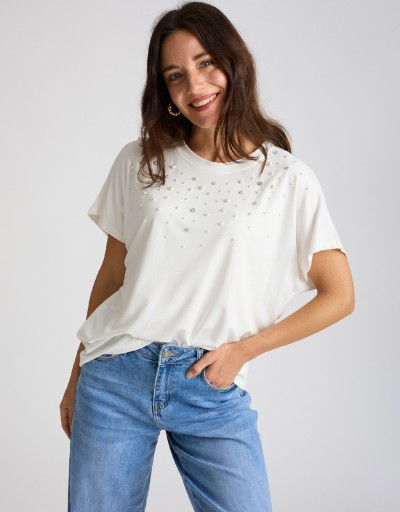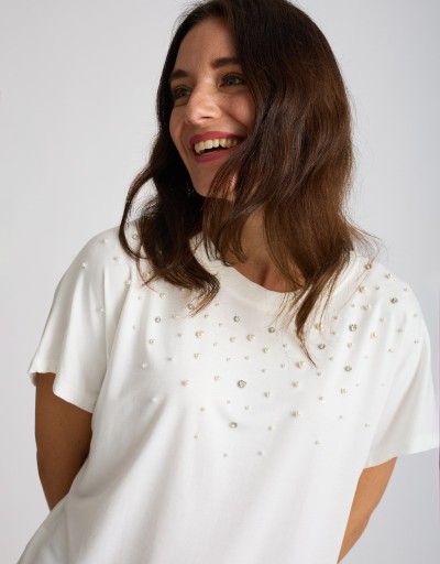 Maglietta in fresco e leggero tessuto misto viscosa dal modello over, comoda e contemporanea. Il dettaglio di perle e castoni applicati sul davanti dona un tocco elegante e sofisticato, trasformando un capo basic in un elemento distintivo del tuo guardaroba. Perfetta per look quotidiani chic o abbinamenti più ricercati nelle giornate primaverili ed estive.