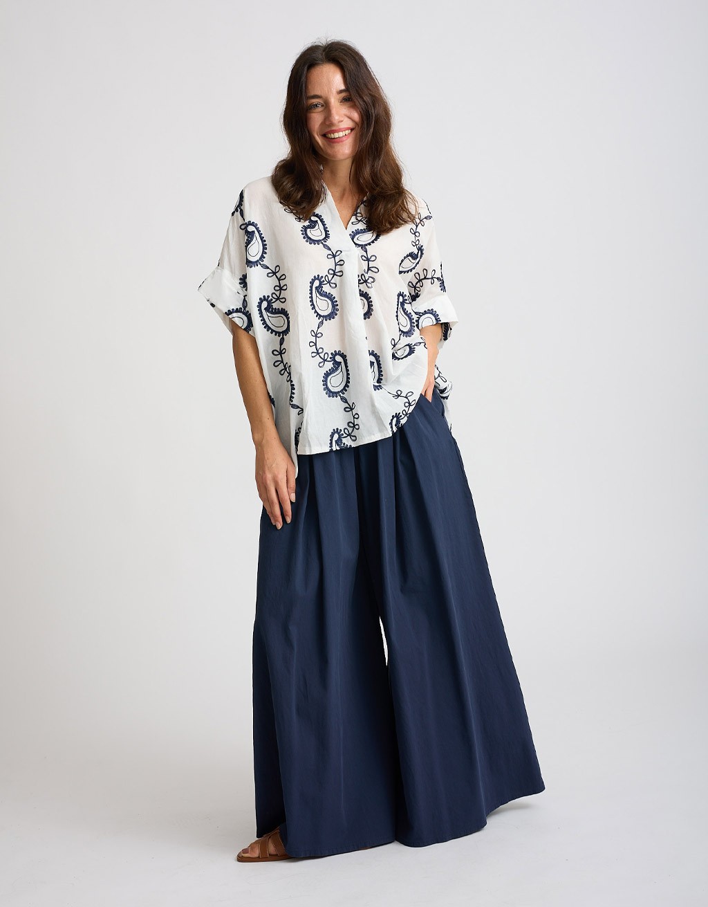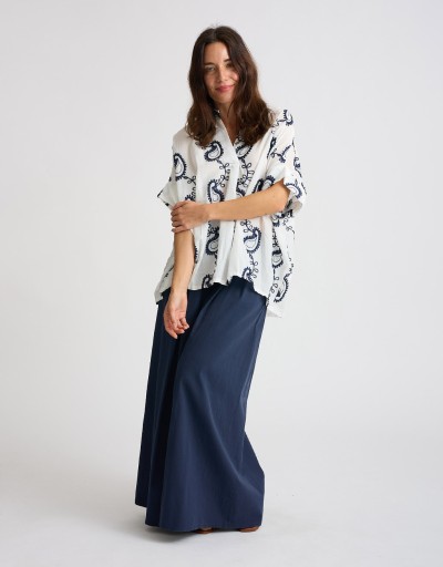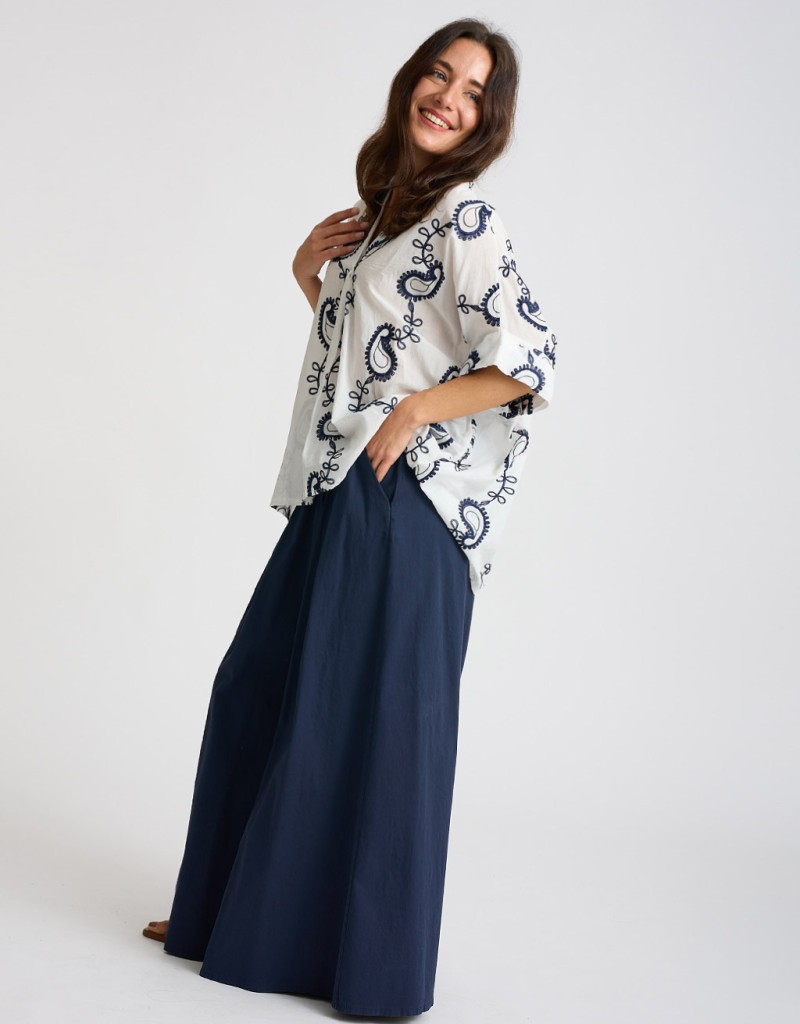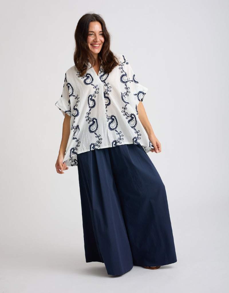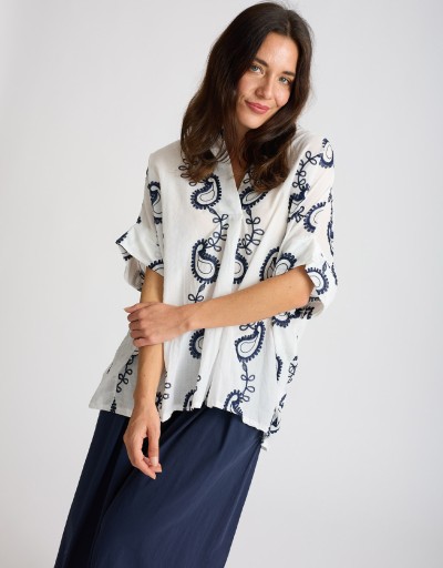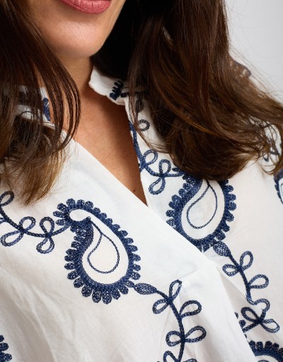 Camicione in fresco e leggero cotone con delicati ricami in contrasto, perfetto per le giornate primaverili ed estive. La scollatura a V e le maniche corte con risvolto aggiungono un tocco femminile, mentre il taglio leggermente più lungo dietro crea movimento e stile.