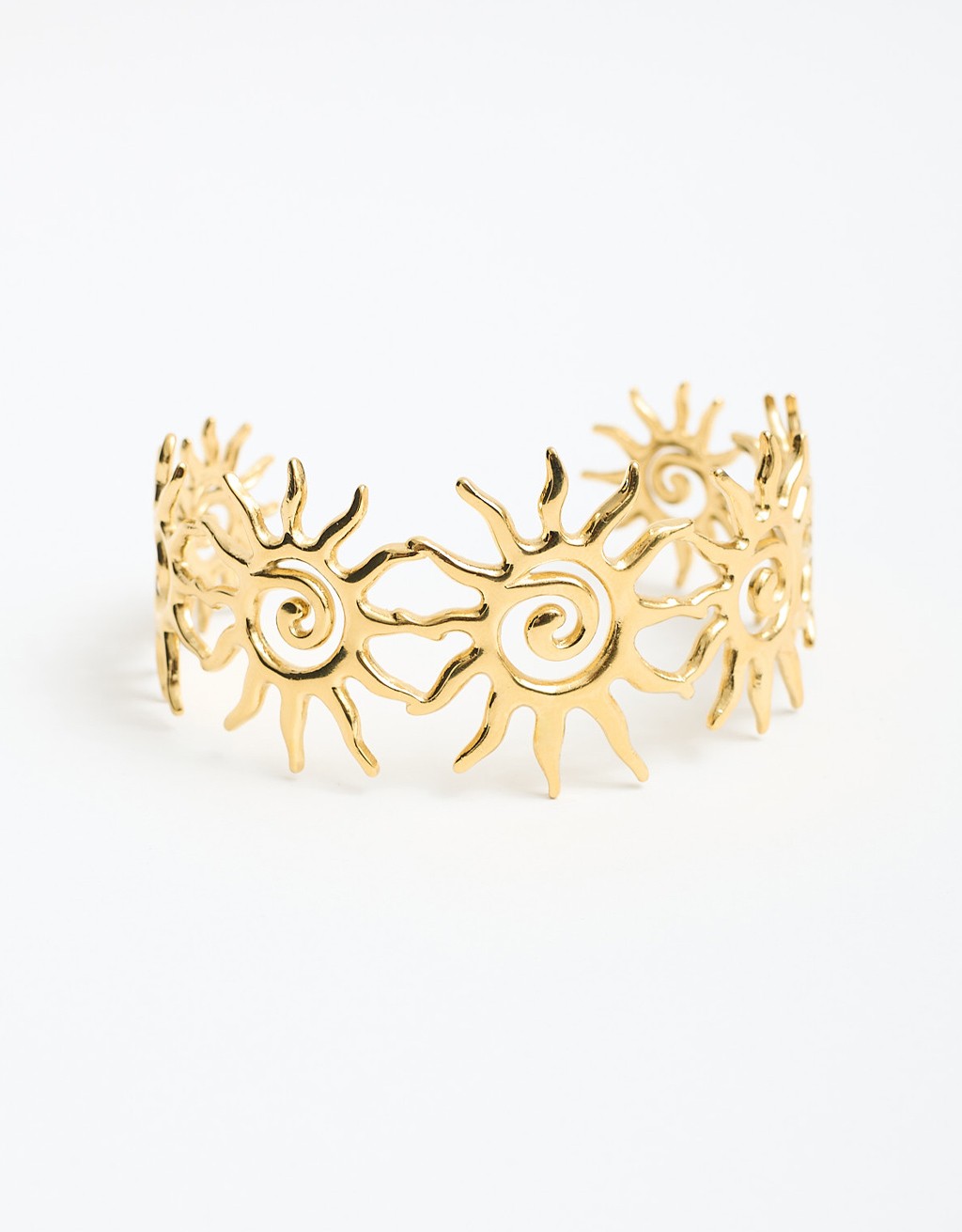 Bracciale in acciaio dal design aperto e creativo, caratterizzato da dettagli a forma di sole che donano movimento e personalità. Un accessorio originale che cattura lo sguardo e completa il look con un tocco deciso ma elegante. Perfetto per chi ama distinguersi con stile, dal giorno alla sera.