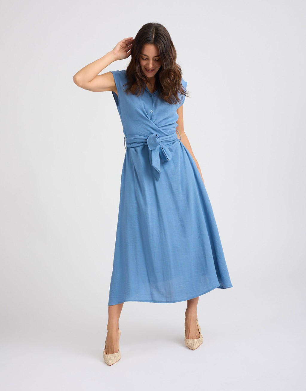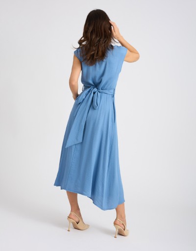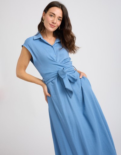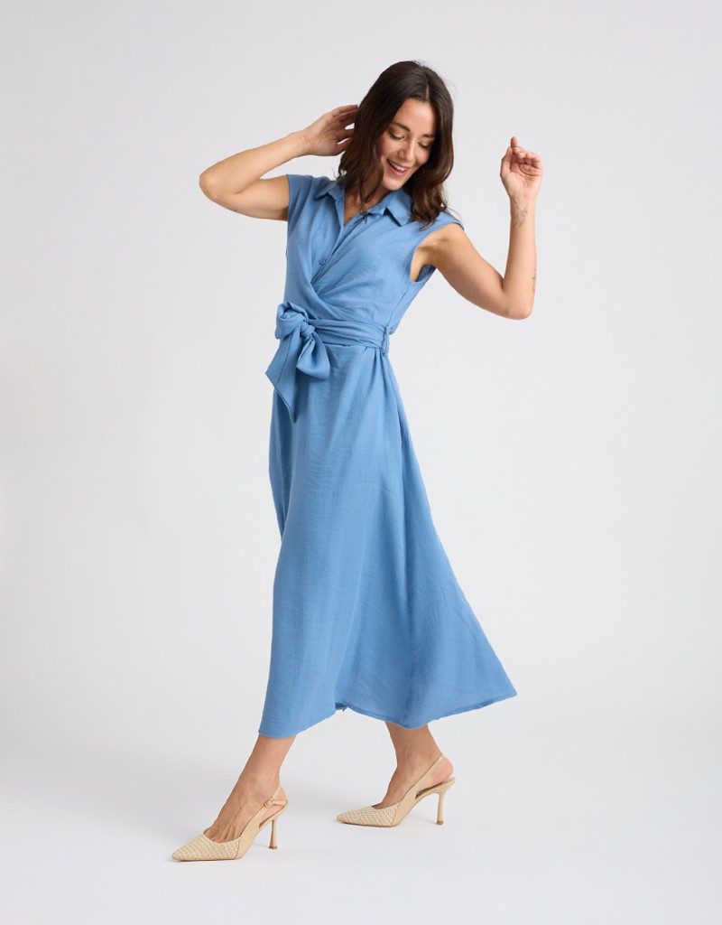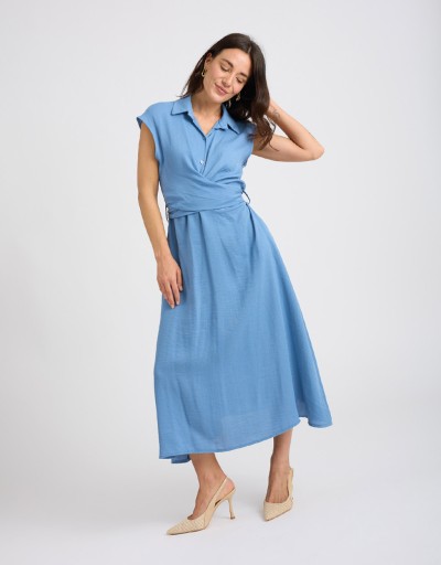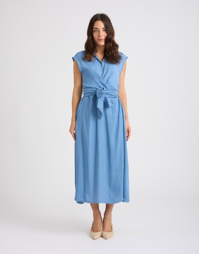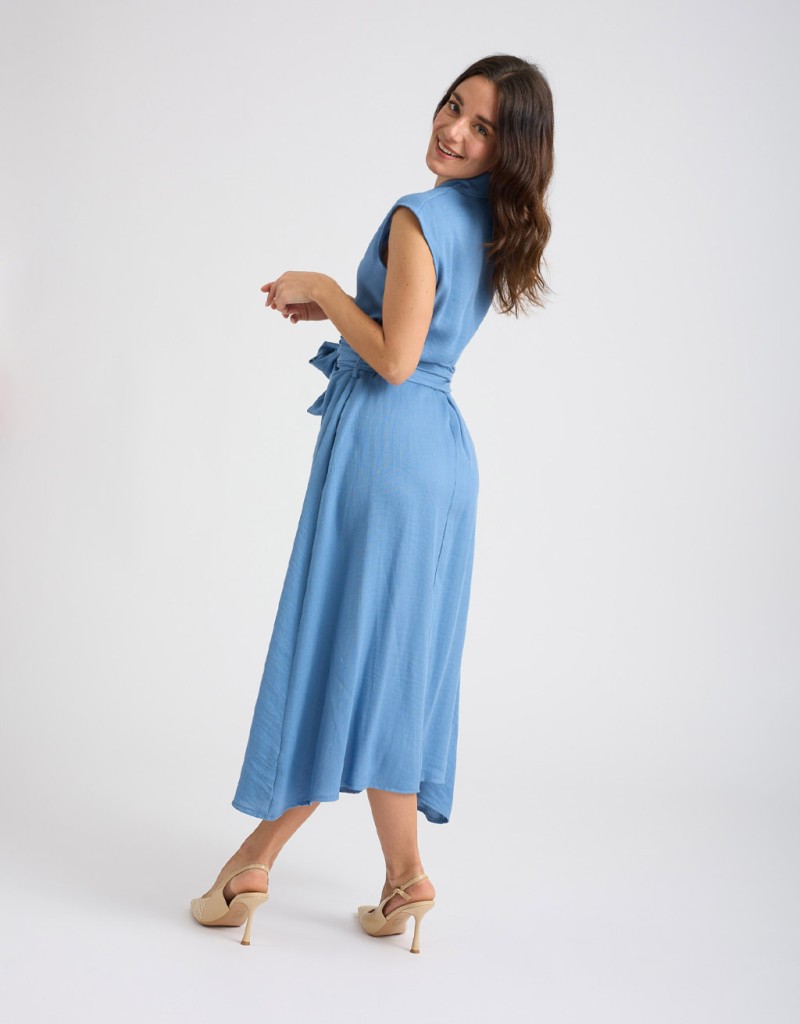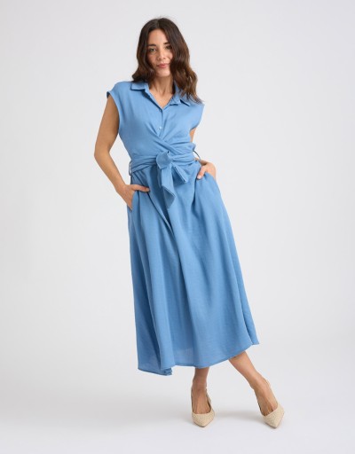 Abito lungo in misto viscosa effetto lino, fresco e leggero. Smanicato e con collo a camicia, presenta una chiusura frontale con bottoni e un elegante incrocio sul davanti che valorizza la silhouette. La fascia annodata sulla schiena completa il design con un tocco femminile e raffinato.