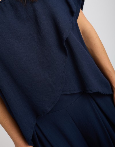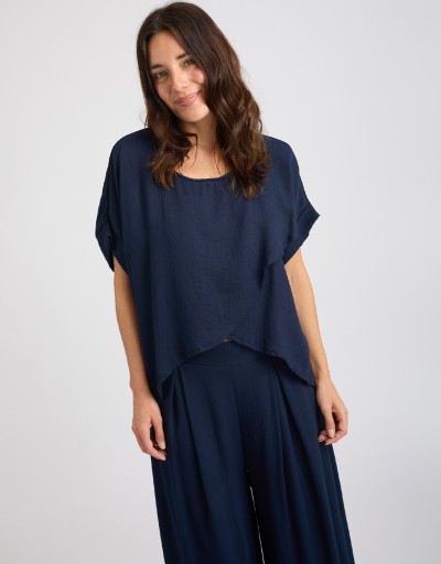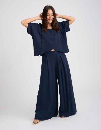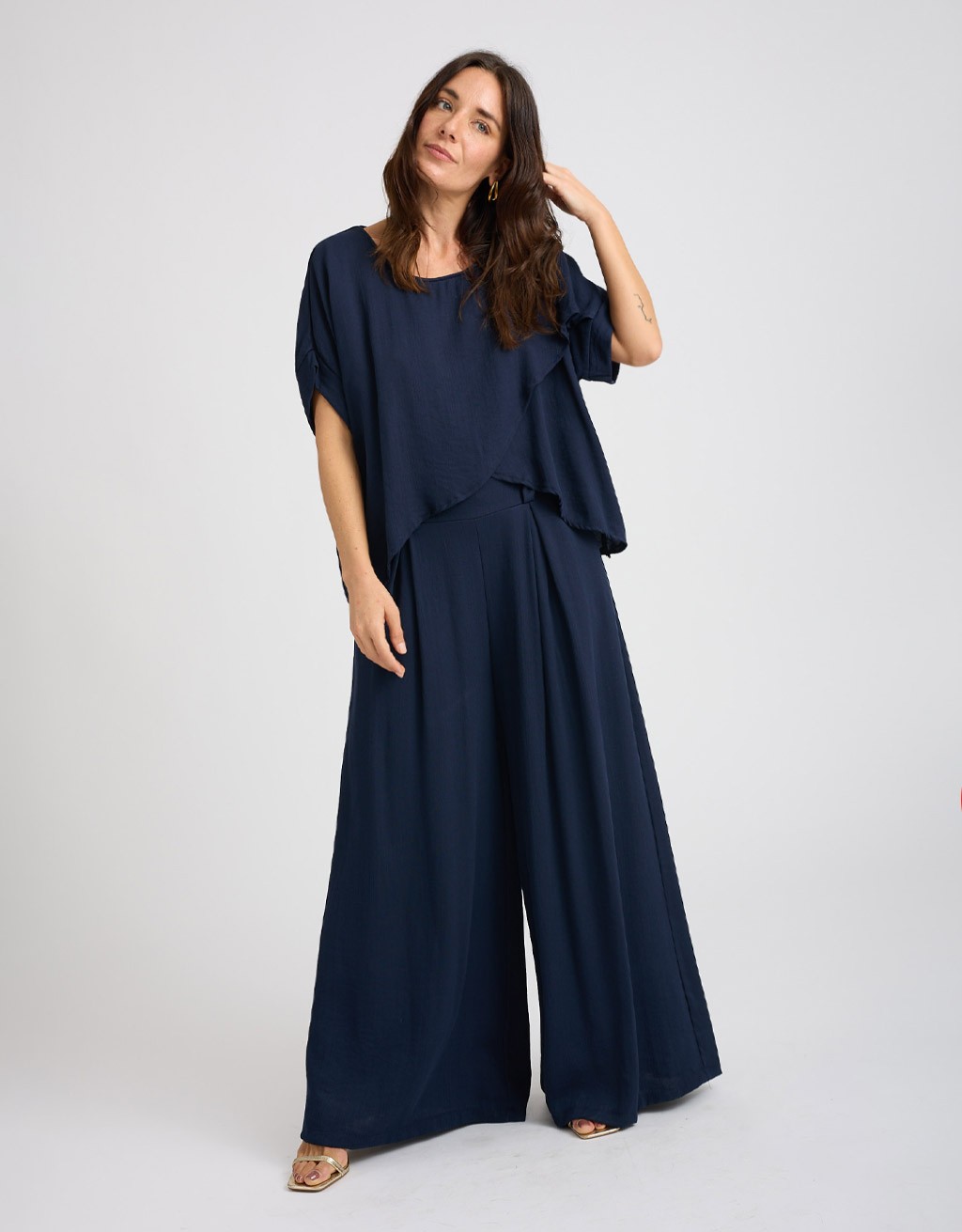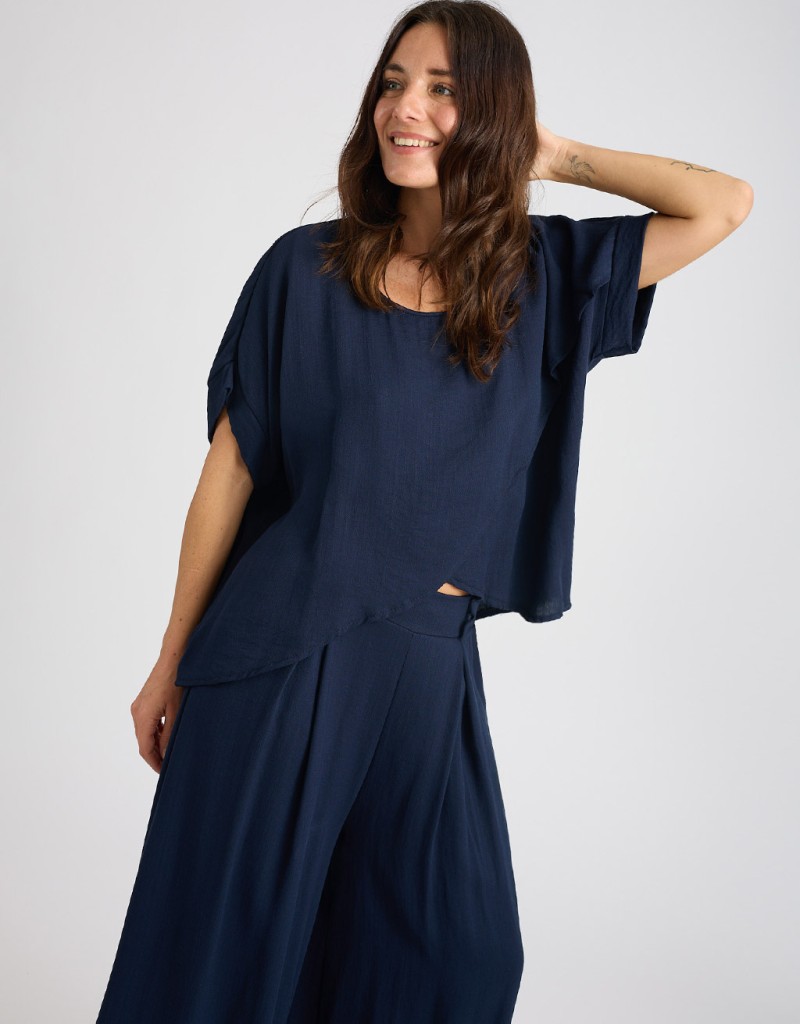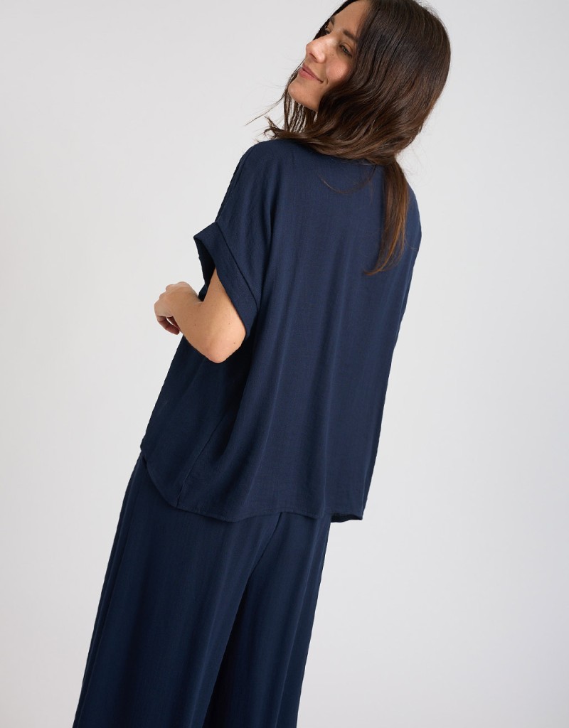 Camicetta over in misto viscosa effetto lino, leggera e fresca, perfetta per le giornate primaverili ed estive. La scollatura a giro e il motivo incrociato sul davanti creano un gioco di volumi moderno, accorciando leggermente la parte frontale e donando un tocco contemporaneo al classico taglio over. Un capo versatile, comodo ma sempre elegante.