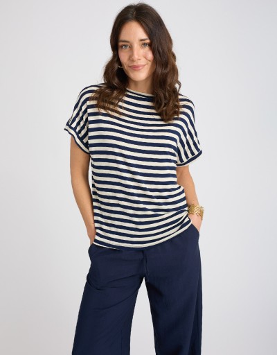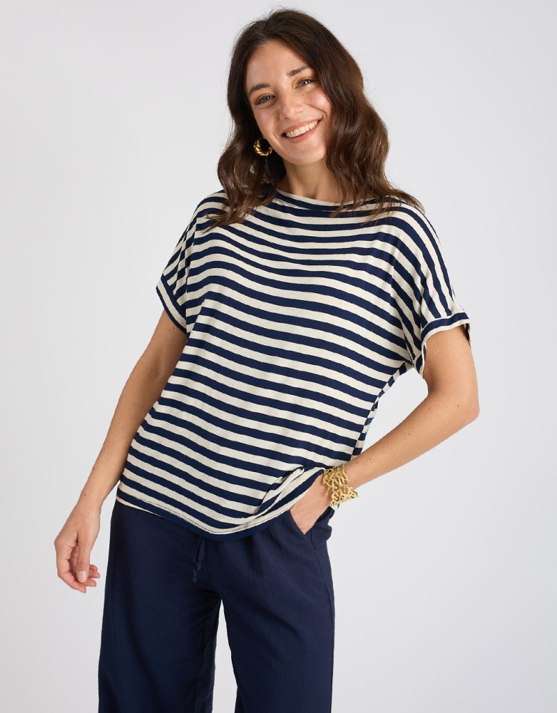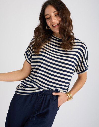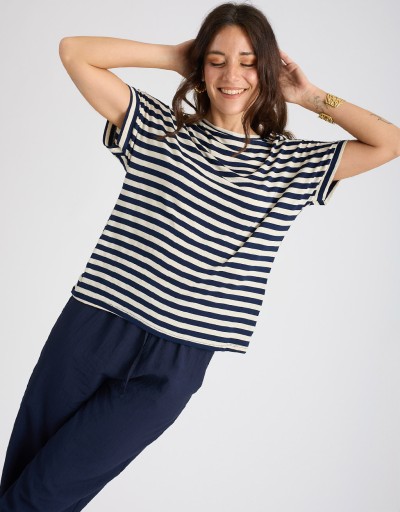 Maglietta in misto viscosa/lino, fresca e leggera, con fantasia a righe dal gusto attuale e versatile. Il tessuto elasticizzato e la vestibilità morbida garantiscono comfort e libertà di movimento, mentre la scollatura a giro e la manica corta la rendono un capo essenziale ma curato. Perfetta per la stagione primaverile ed estiva.