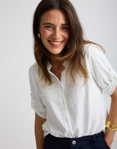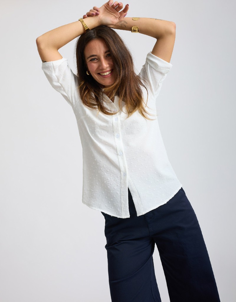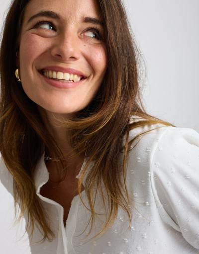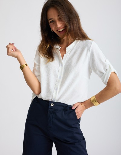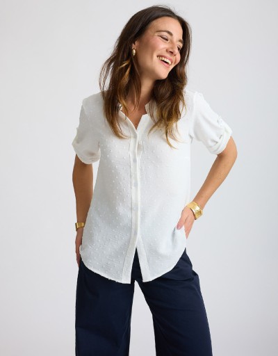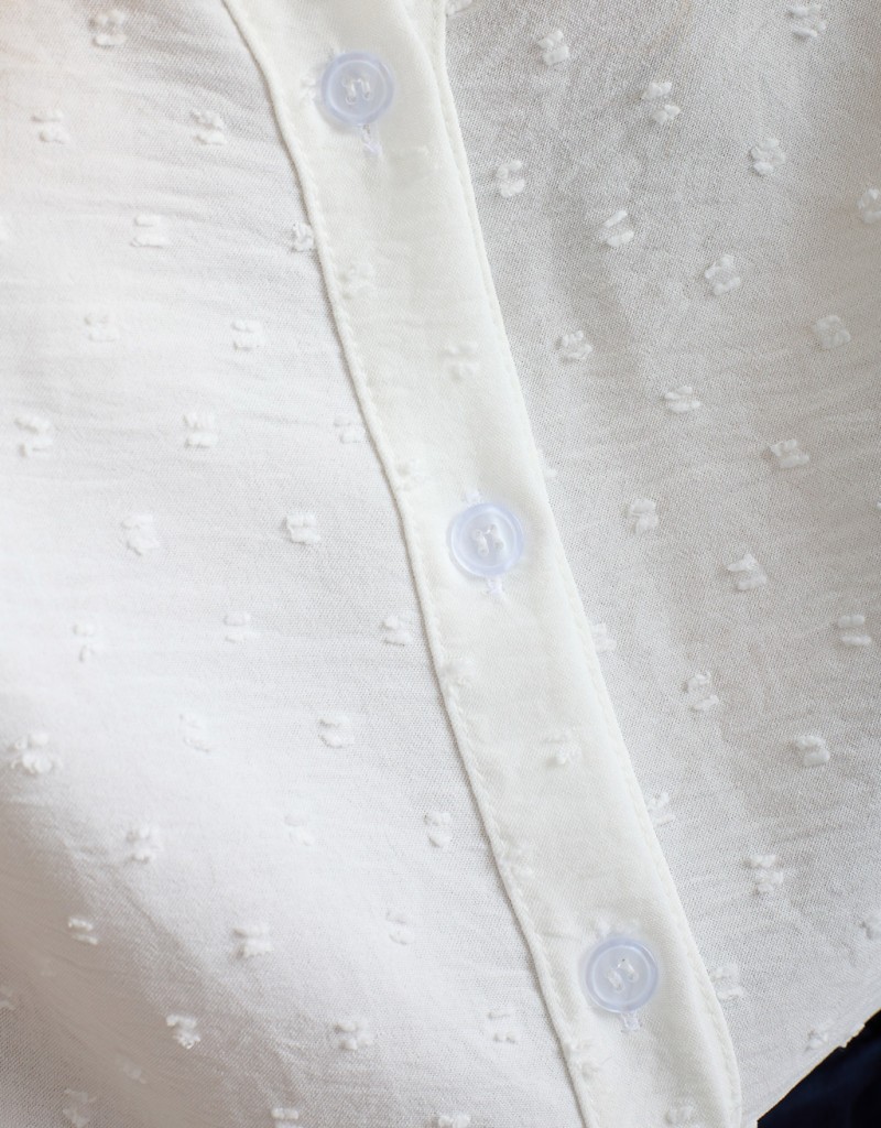 Camicia in tessuto fresco e leggero con pallini in rilievo che aggiungono texture e originalità al capo. Il collo alla coreana e la scollatura a V donano un tocco elegante, mentre la chiusura frontale con bottoni e la manica lunga roll-up la rendono pratica e versatile. Perfetta per look primaverili ed estivi casual ma curati.