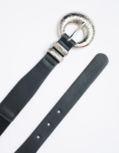 Decisa e sofisticata, questa cintura elastica è pensata per valorizzare la silhouette con stile. La maxi fibbia lavorata cattura subito lo sguardo, aggiungendo un tocco grintoso e contemporaneo. Perfetta per segnare il punto vita con eleganza e dare carattere anche ai look più semplici.