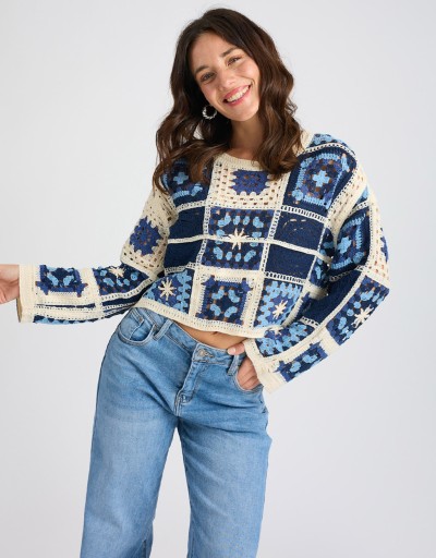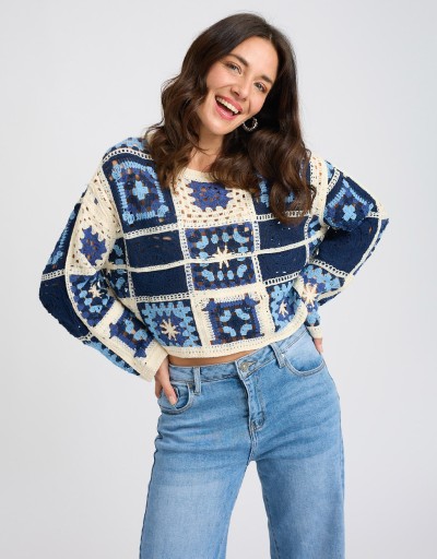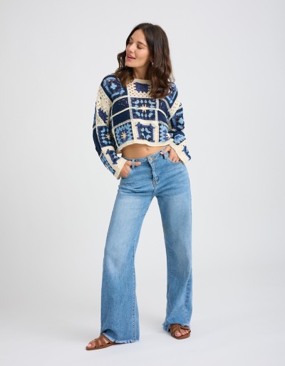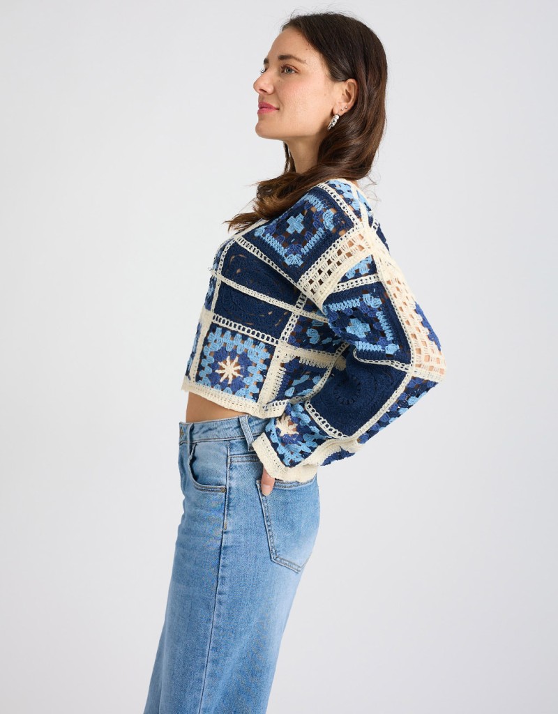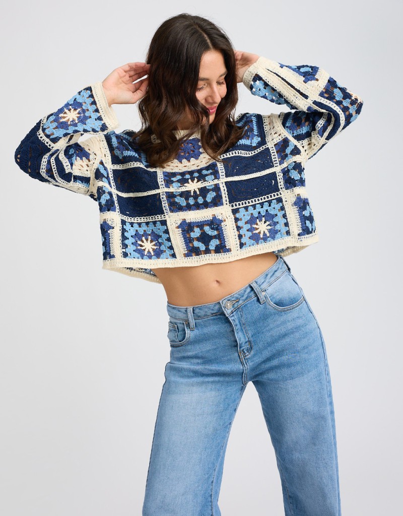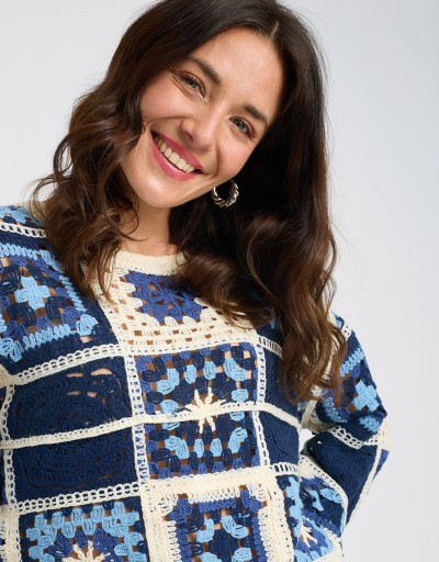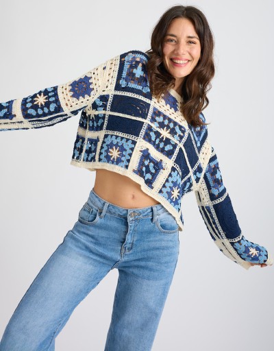 Maglietta crop in crochet dal fascino artigianale, caratterizzata da una vivace fantasia multicolor nelle tonalità del blu. La lavorazione traforata dona leggerezza e un effetto vedo-non-vedo super attuale, mentre la scollatura a giro la rende facile da indossare e abbinare. Vestibilità fresca e disinvolta, perfetta per dare un tocco trendy anche ai look più semplici.