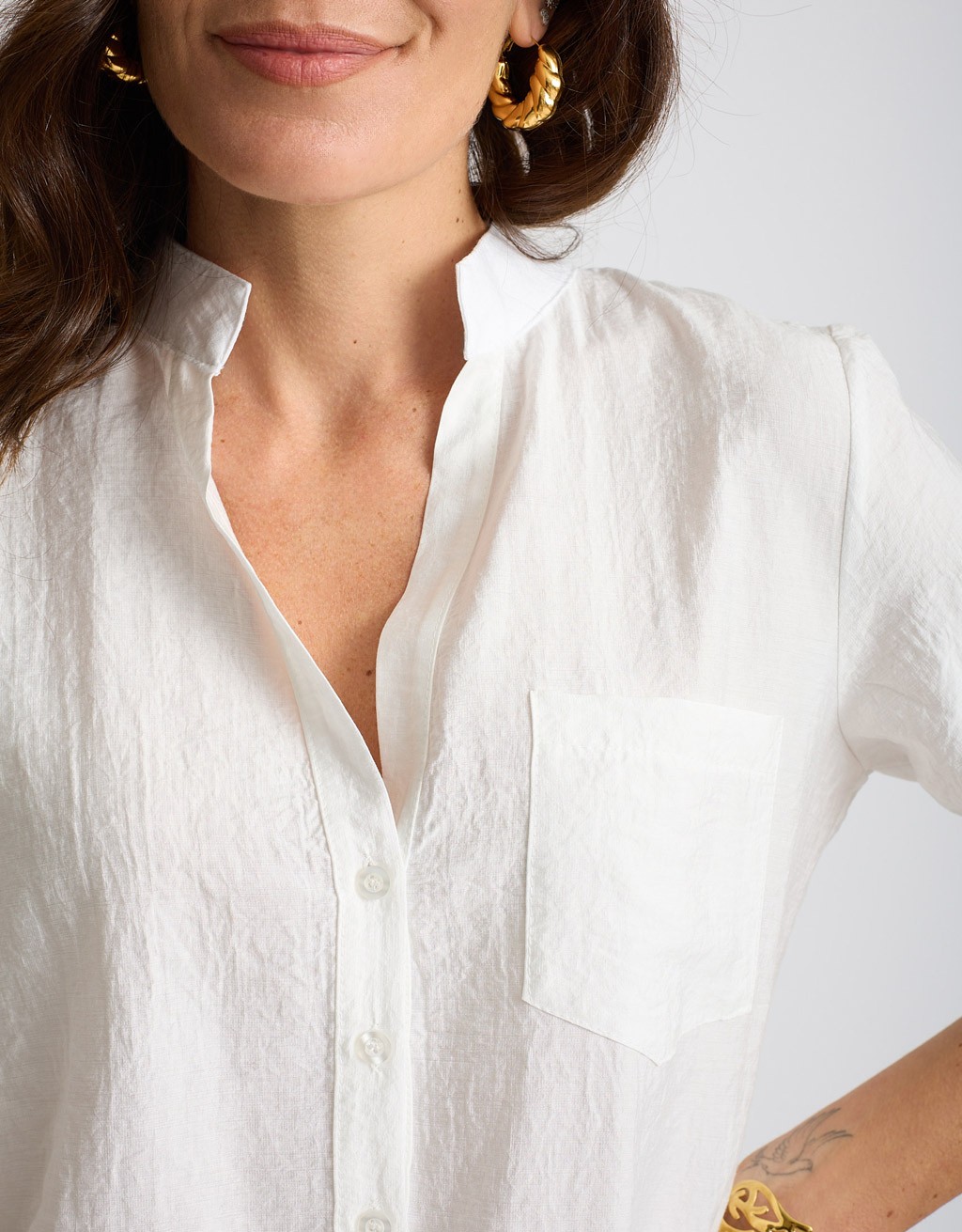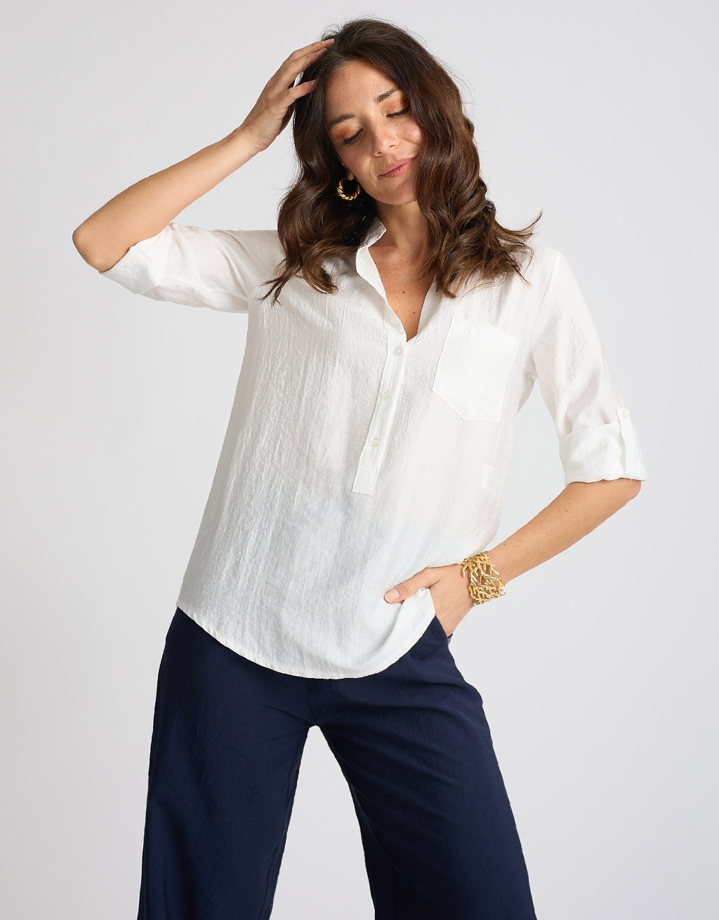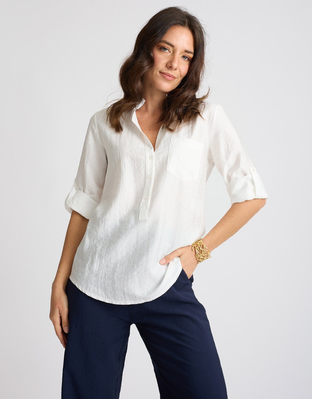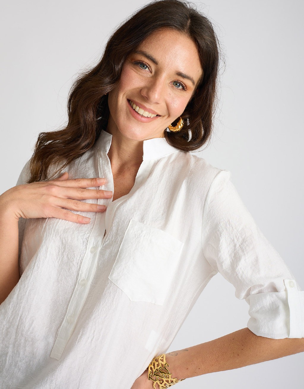 Blusa in tessuto fresco e leggero dall’effetto stropicciato, perfetta per i look primaverili ed estivi. Il collo alla coreana e la scollatura a V creano un equilibrio raffinato, mentre il taschino frontale e la lunghezza leggermente più lunga dietro aggiungono dinamismo al capo. Le maniche 3/4 roll-up la rendono pratica e versatile, ideale da indossare tutto il giorno.