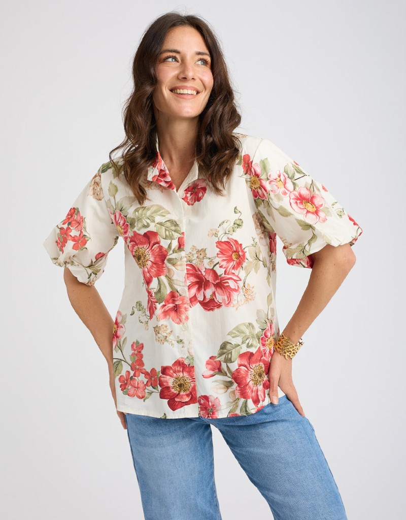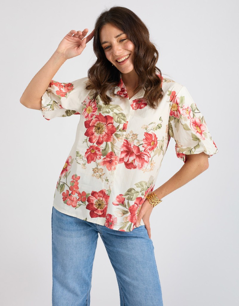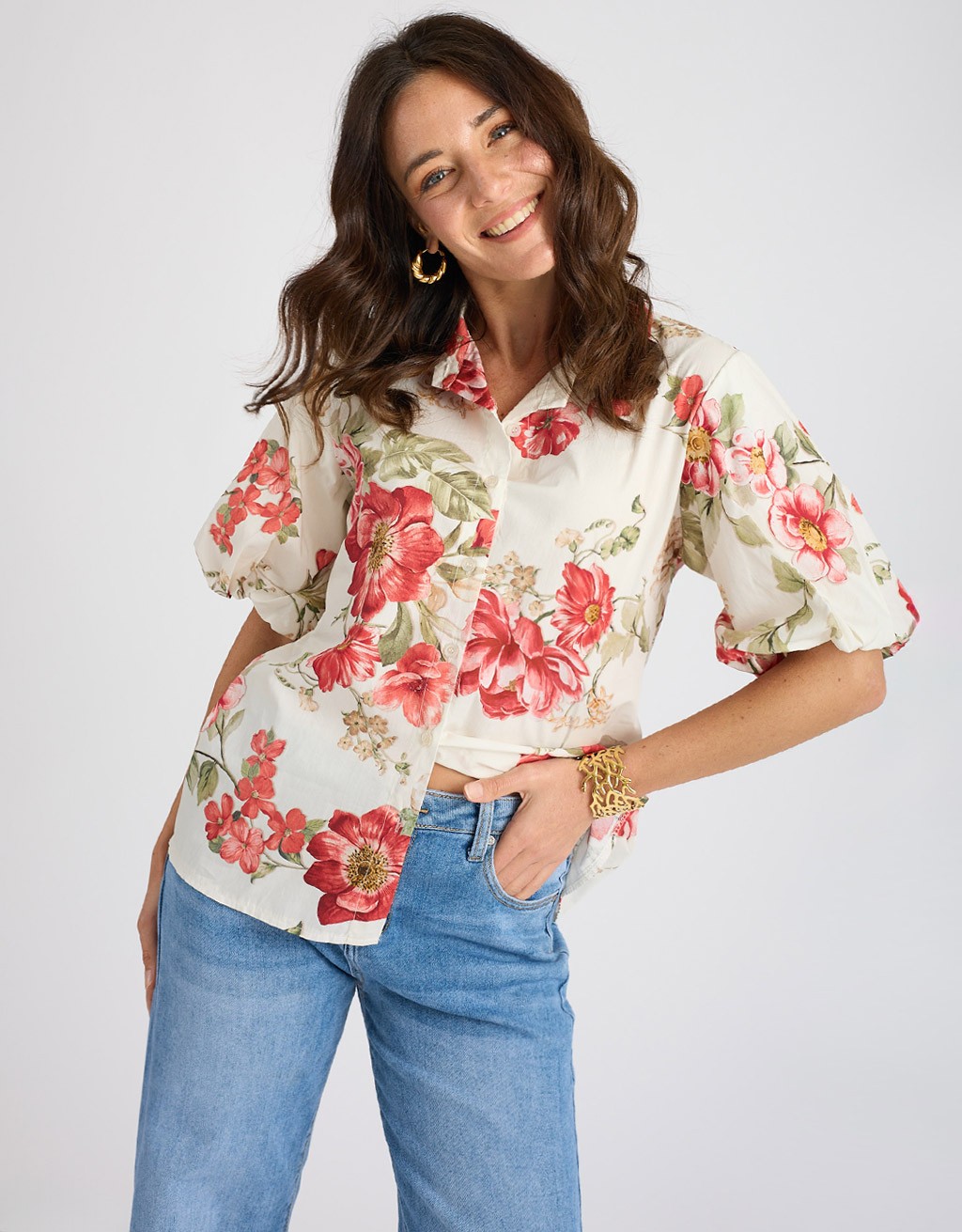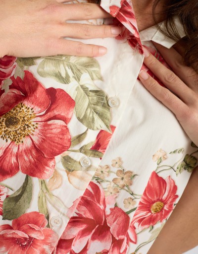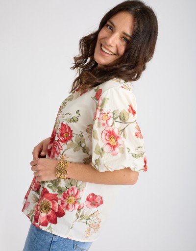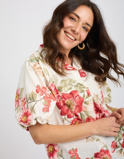 Camicia in fresco cotone dalla fantasia floreale delicata, perfetta per i look primaverili ed estivi. Il collo a revers e la chiusura frontale con bottoni donano un tocco classico, mentre le maniche corte a palloncino aggiungono un dettaglio femminile e romantico. Leggera e versatile, è ideale per outfit freschi e di tendenza.
