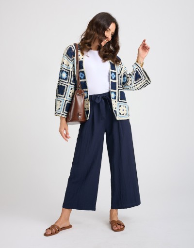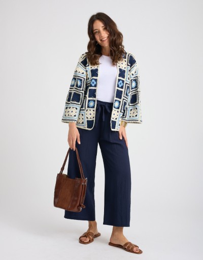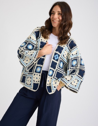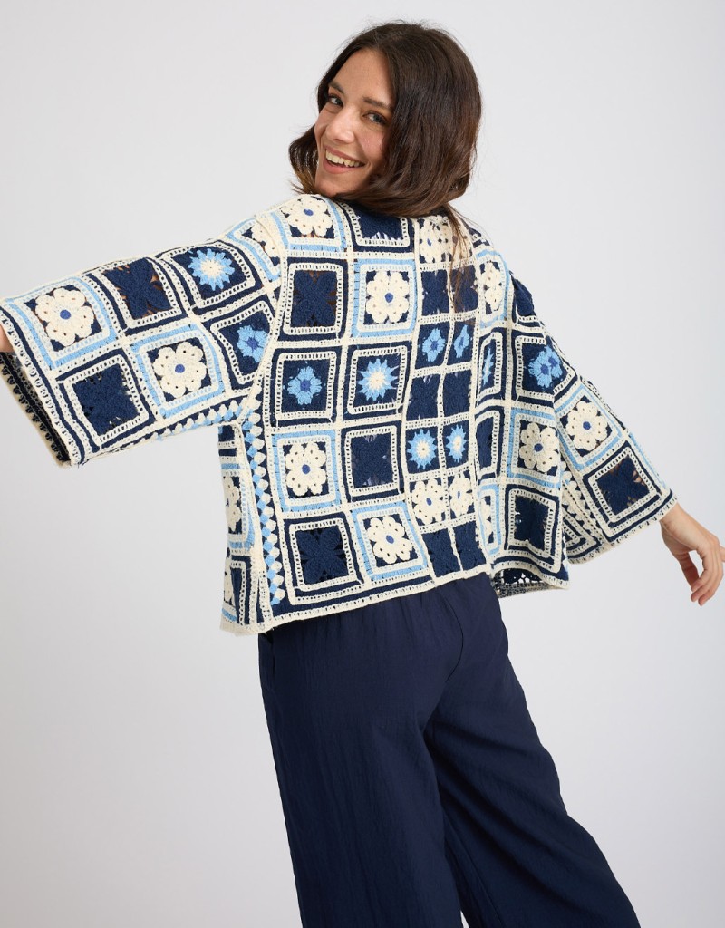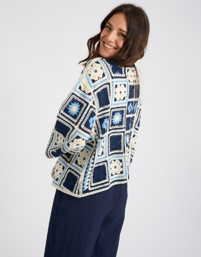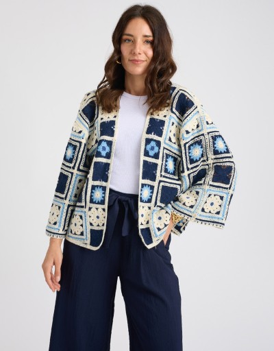 Giacca in crochet multicolor nelle tonalità del blu, perfetta per aggiungere un tocco ricercato e originale ai tuoi look. Il design aperto e la manica 3/4 ampia la rendono leggera e versatile, ideale per completare outfit primaverili con stile. Vestibilità morbida che valorizza senza segnare.