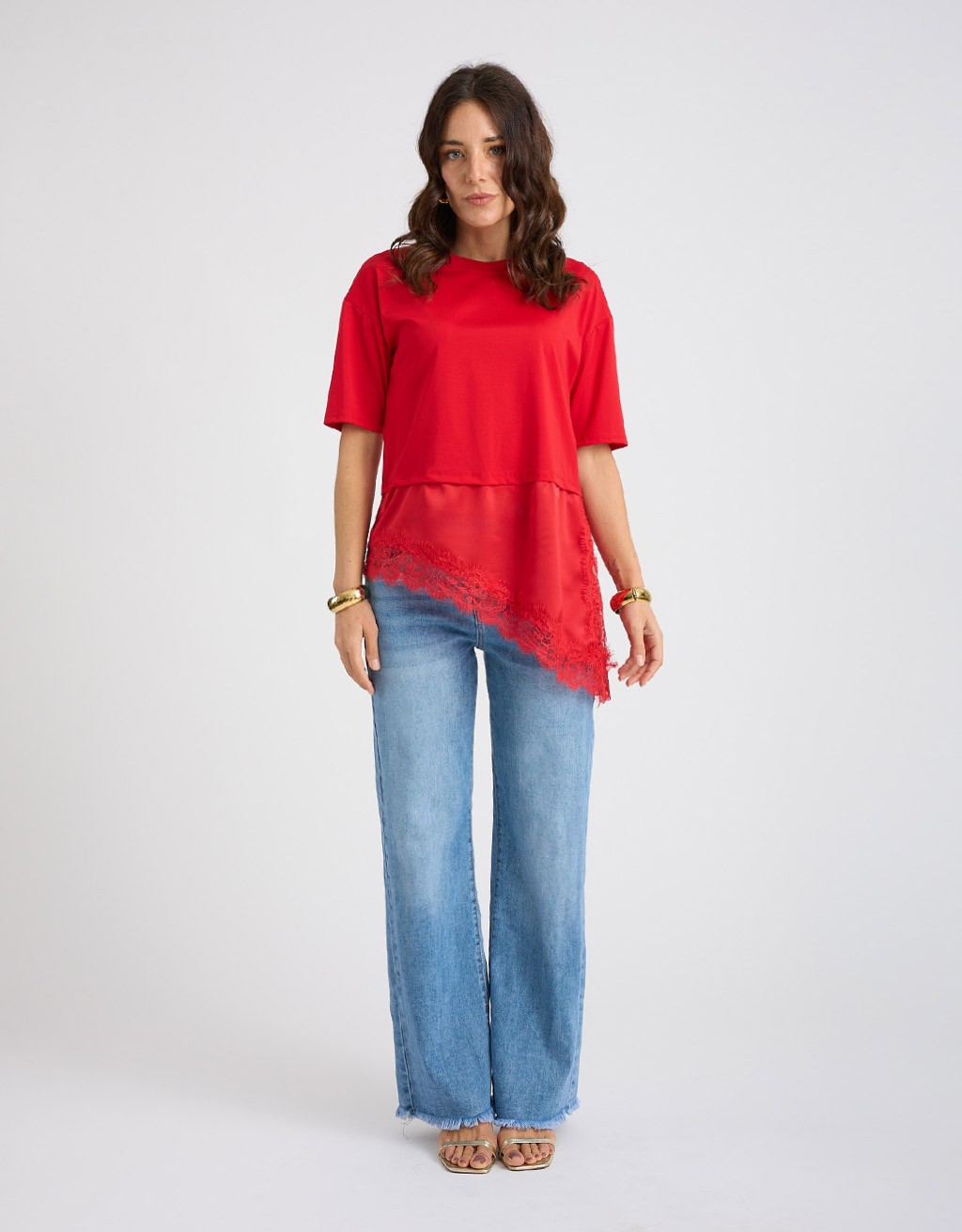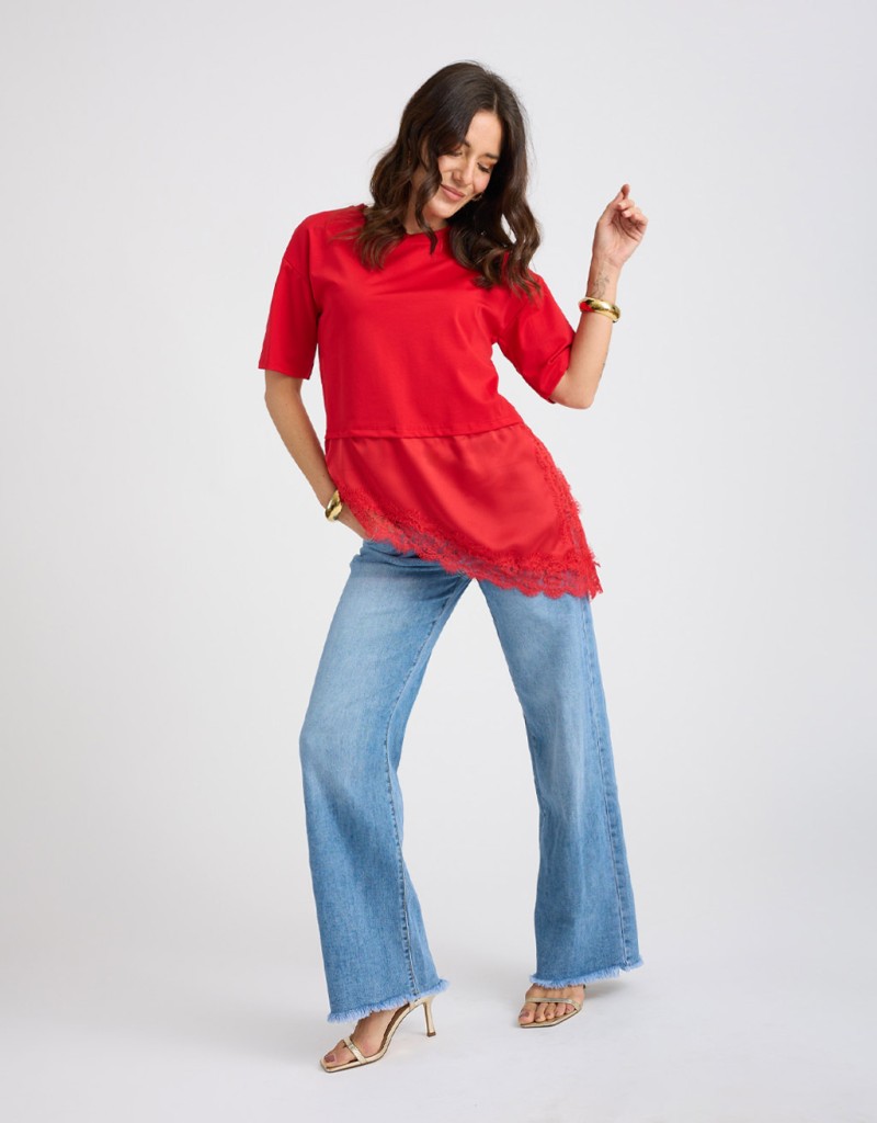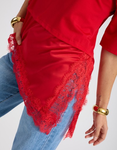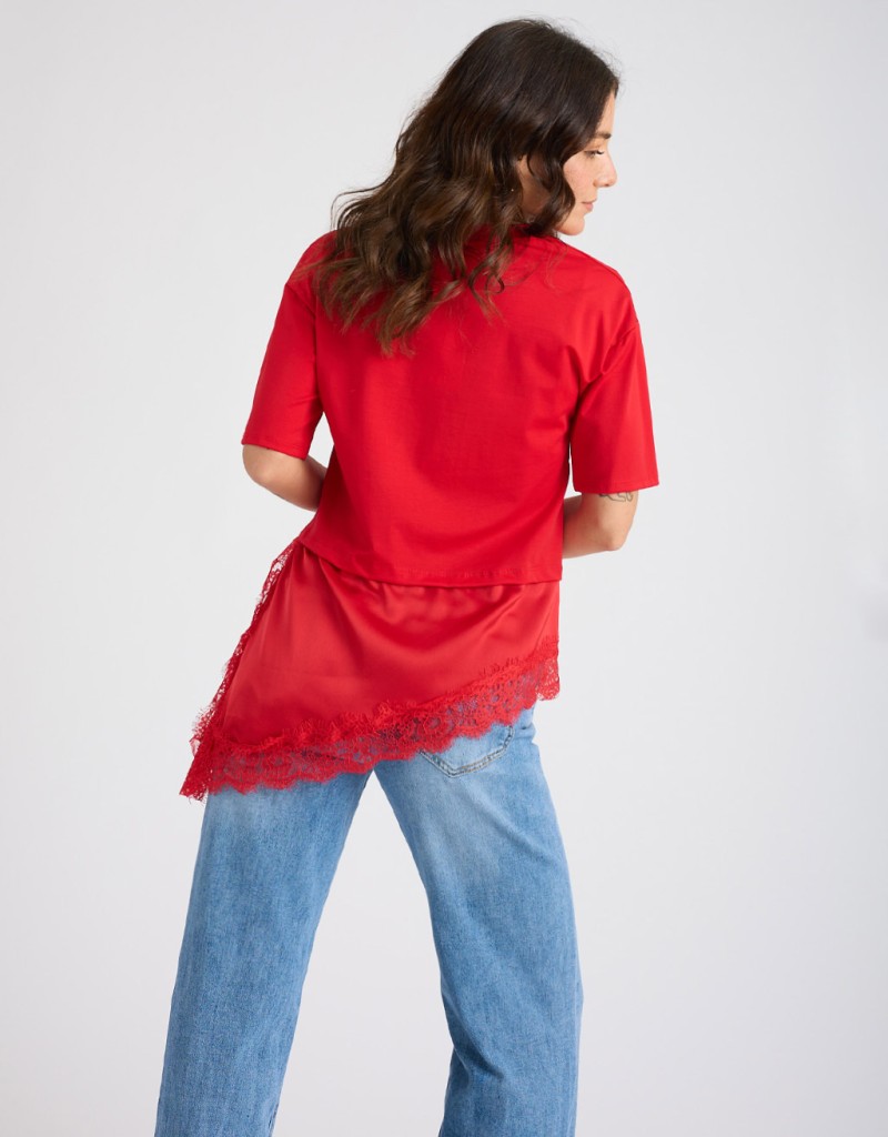 Maglietta in due tessuti diversi, con parte superiore in morbido misto viscosa e parte inferiore in tessuto lucido effetto raso, tagliata diagonalmente sul fondo. Lo spacco laterale con dettaglio in pizzo dona un tocco femminile e raffinato, perfetta per look sofisticati ma contemporanei.