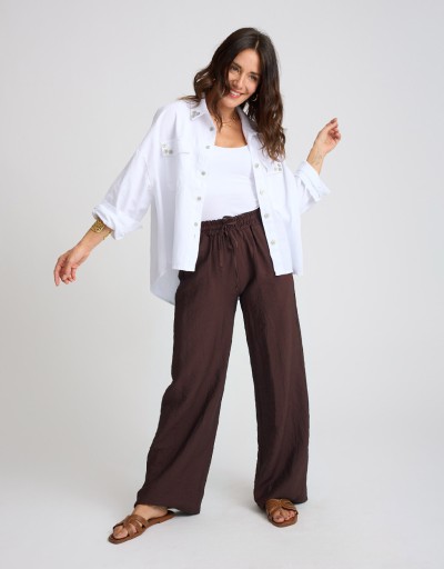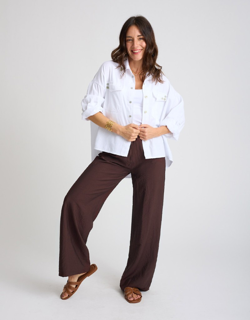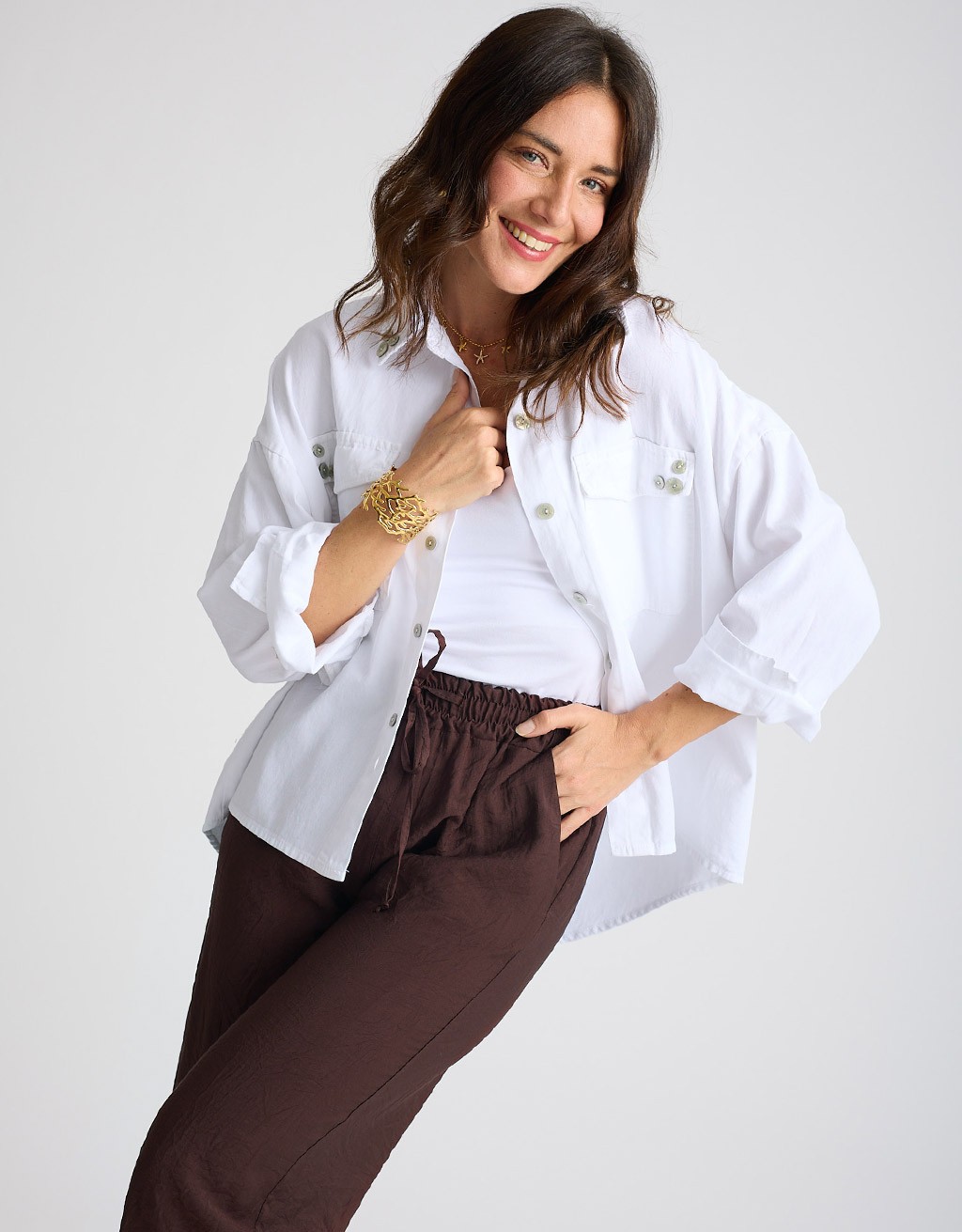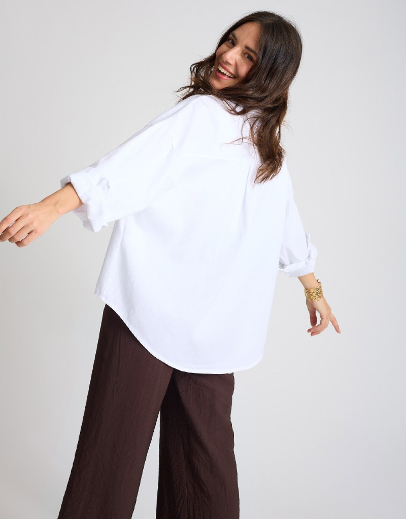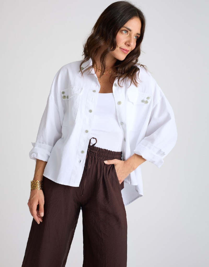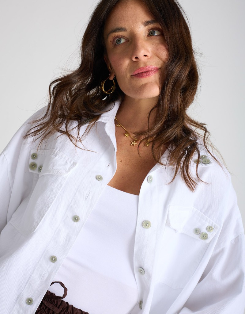 Giacca modello camicia a manica lunga dal taglio over, realizzata in cotone fresco e leggero, perfetta per la mezza stagione e per serate fresche estive. Il design pulito in tinta unita è arricchito da raffinati bottoni in madreperla applicati sul colletto e vicino alle tasche, che donano un tocco luminoso e ricercato. Il fit morbido, leggermente più lungo dietro, garantisce comfort e stile