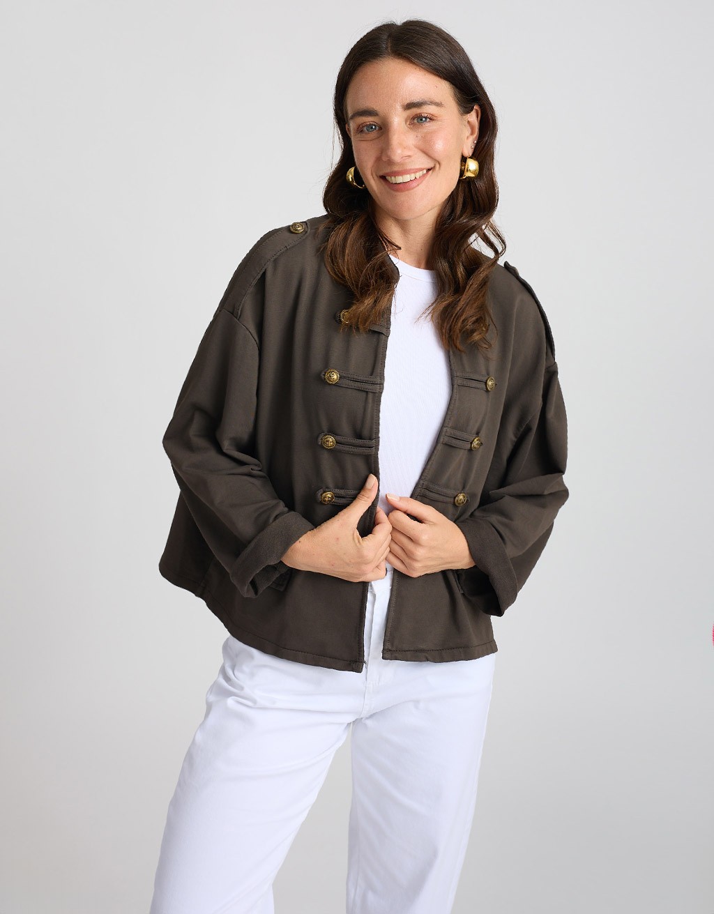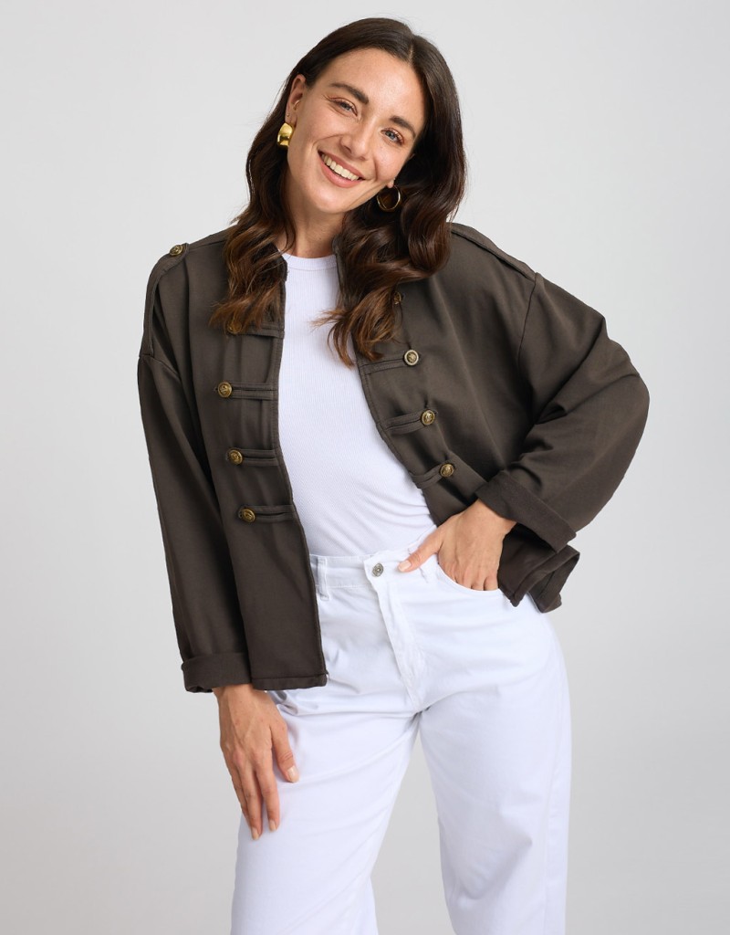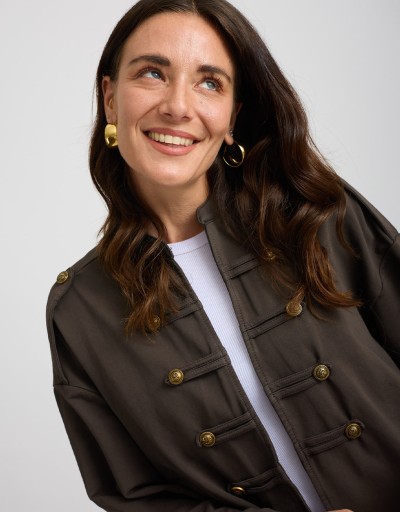 Giacca in morbida felpa elasticizzata non garzata. Il modello aperto con collo alla coreana valorizza la silhouette con un tocco essenziale ma ricercato, mentre gli alamari frontali aggiungono carattere e originalità al capo. Confortevole e versatile, è ideale per completare look quotidiani con un twist moderno.