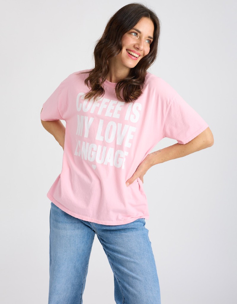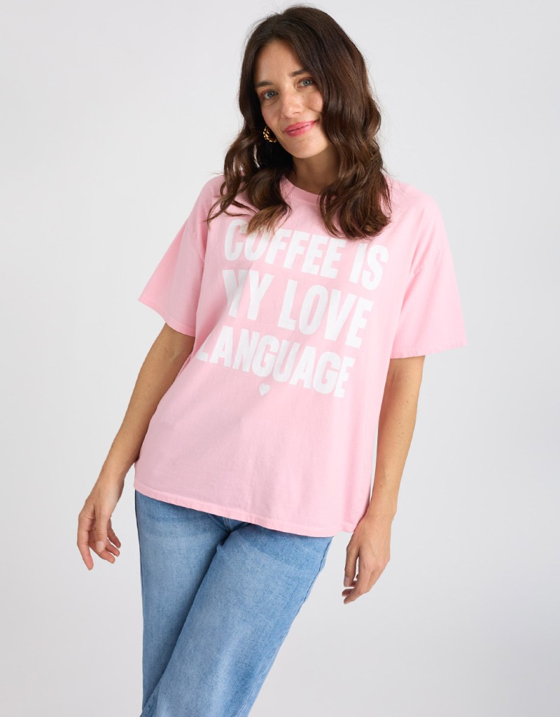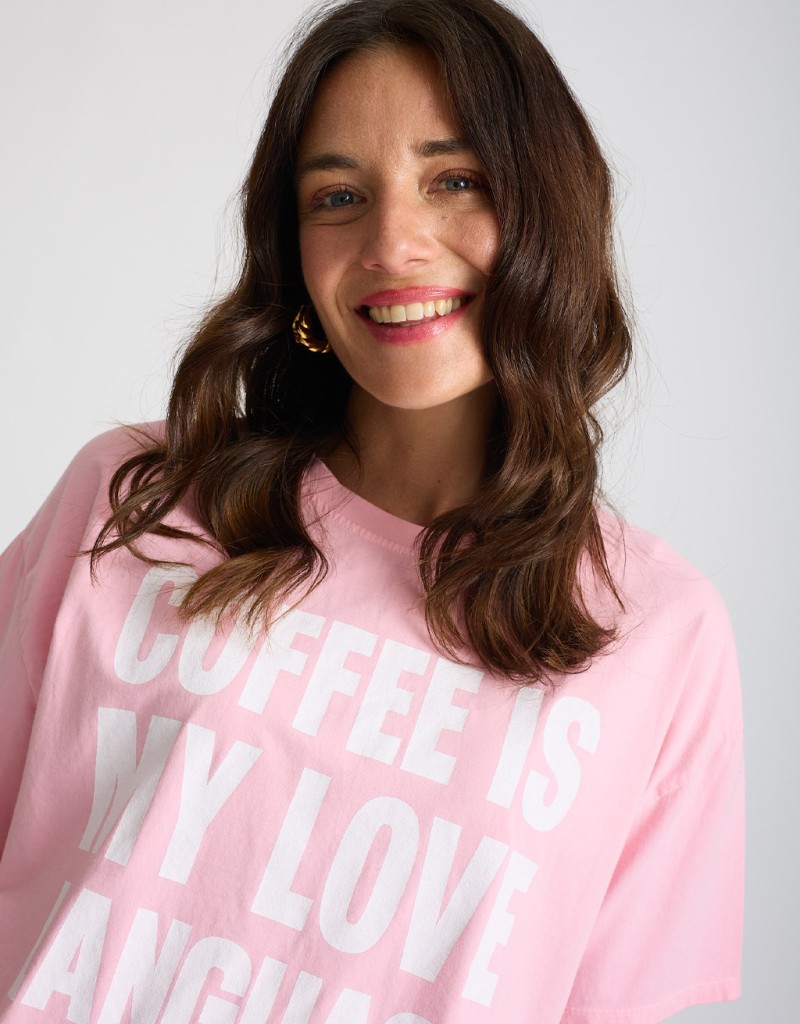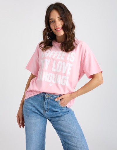 T-shirt in cotone con effetto tinto freddo dal carattere contemporaneo e leggermente vissuto. Il modello morbido e il girocollo la rendono perfetta per un look casual ma curato, mentre la stampa frontale “Coffee is my love language” aggiunge un tocco ironico e di personalità. Ideale per le giornate primaverili, è il capo easy che non passa inosservato.