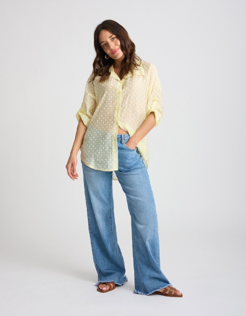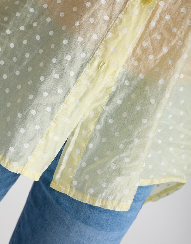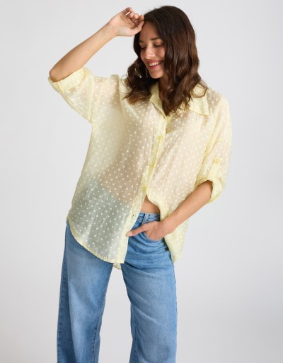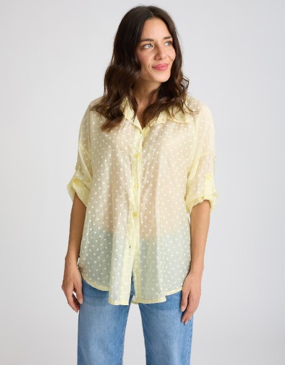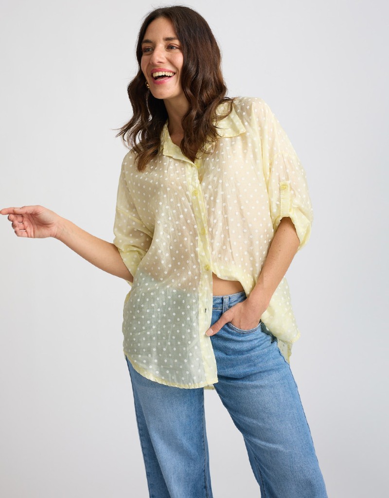 Camicia modello over in fresco e leggero tencel fantasia pois, perfetta per le giornate primaverili. Il collo a revers e la chiusura frontale con bottoni donano un tocco classico, mentre la manica 3/4 con roll-up e il fondo leggermente più lungo dietro aggiungono movimento e modernità. Un capo versatile, facile da abbinare e sempre attuale.