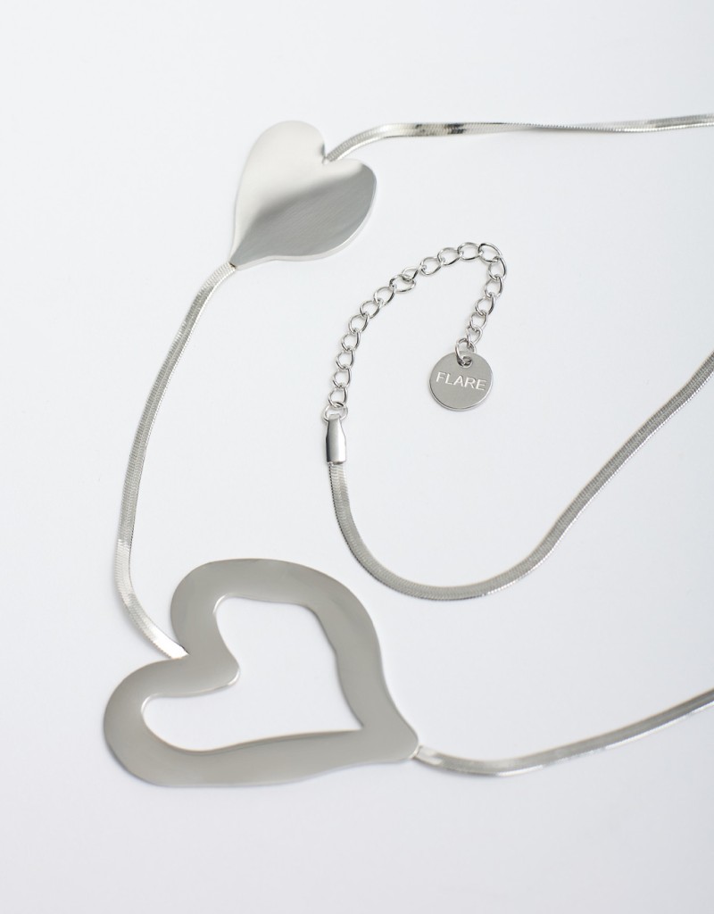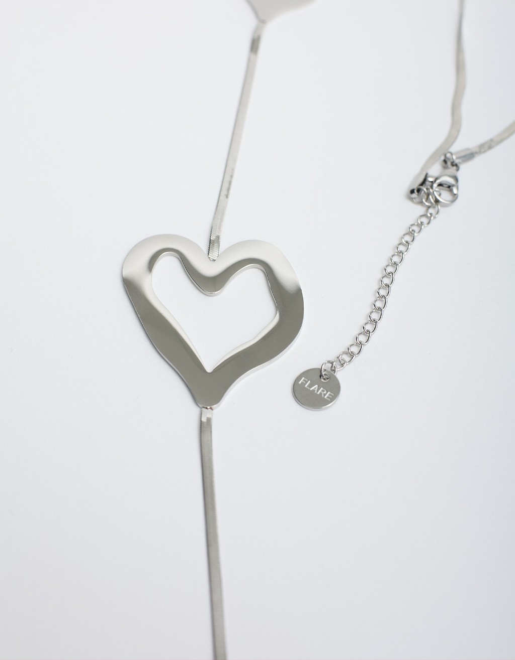 Collana lunga in acciaio con a cuori, dal design romantico ma contemporaneo. Le forme leggere e luminose creano movimento e valorizzano il décolleté con discreta eleganza. Perfetta per dare un tocco femminile ai look quotidiani senza rinunciare a praticità e stile.
