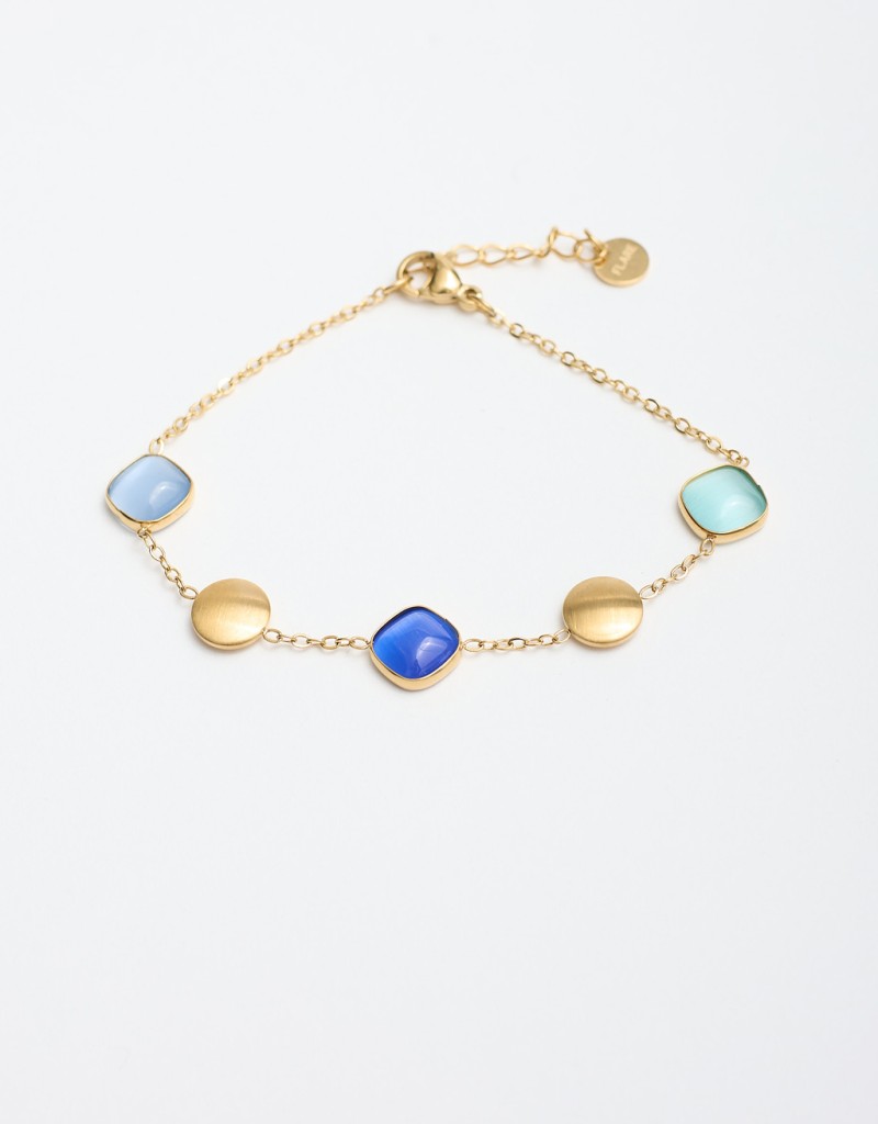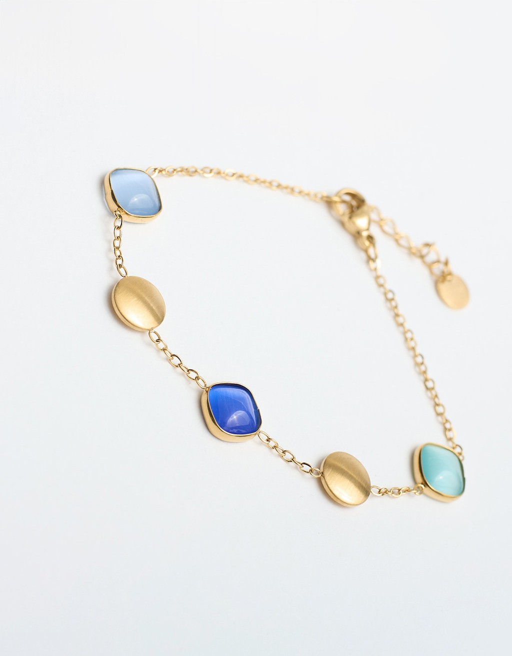 Bracciale in acciaio delicato con catena sottile color oro, arricchito da pietre sfumate nei toni pastello che donano luce e freschezza al polso. Un accessorio discreto ma super femminile, perfetto per completare i look di stagione con un tocco elegante e leggero.