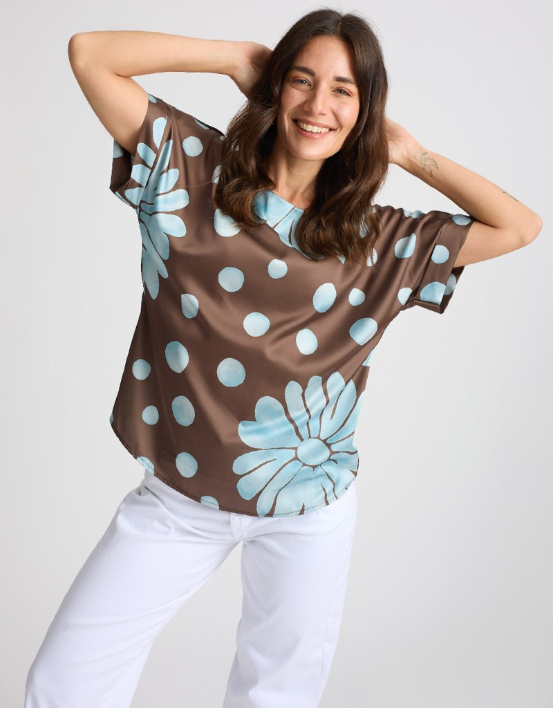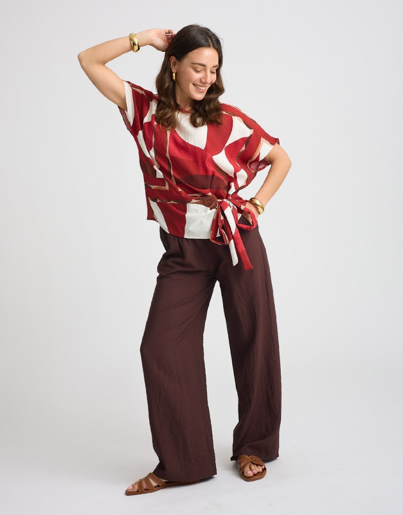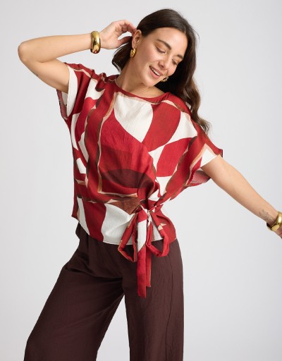 Camicetta in misto viscosa leggera e fresca, perfetta per le giornate più calde. La scollatura a giro è valorizzata da un fiocco annodato sul fianco, un dettaglio elegante che rende il capo femminile e raffinato. La vestibilità fluida la rende ideale sia per look casual che più curati.
