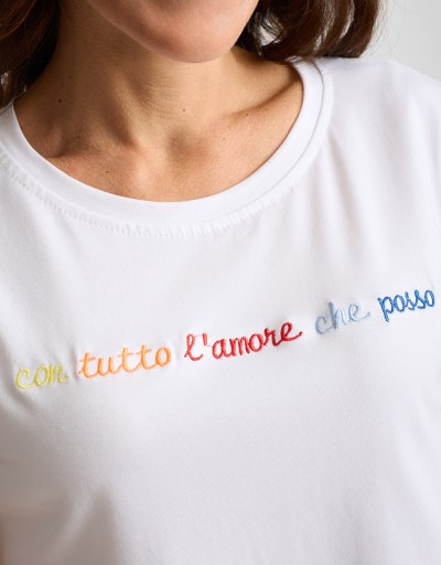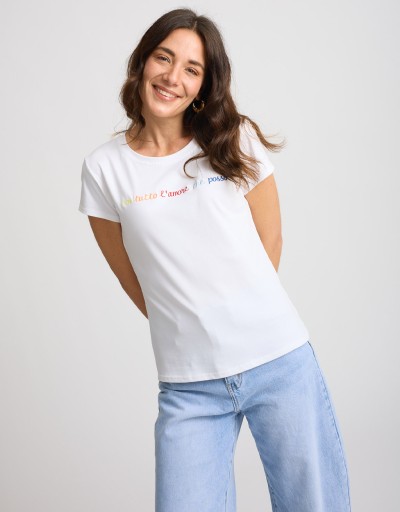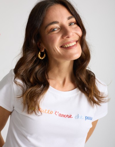 T-shirt in cotone elasticizzato fresco e leggero, ideale per le giornate primaverili ed estive. La scritta frontale multicolore ricamata aggiunge un tocco gioioso e moderno, trasformando un capo basico in un dettaglio fashion che cattura lo sguardo. La vestibilità morbida garantisce comfort senza rinunciare allo stile.