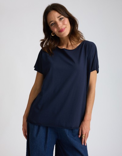 Maglietta over in cotone elasticizzato fresco e leggero, perfetta per un look casual e contemporaneo. La tinta unita versatile si abbina facilmente a qualsiasi outfit, mentre i bordi in taglio vivo aggiungono un dettaglio moderno e originale. La vestibilità ampia garantisce comfort e libertà di movimento.
