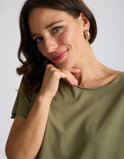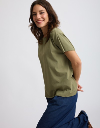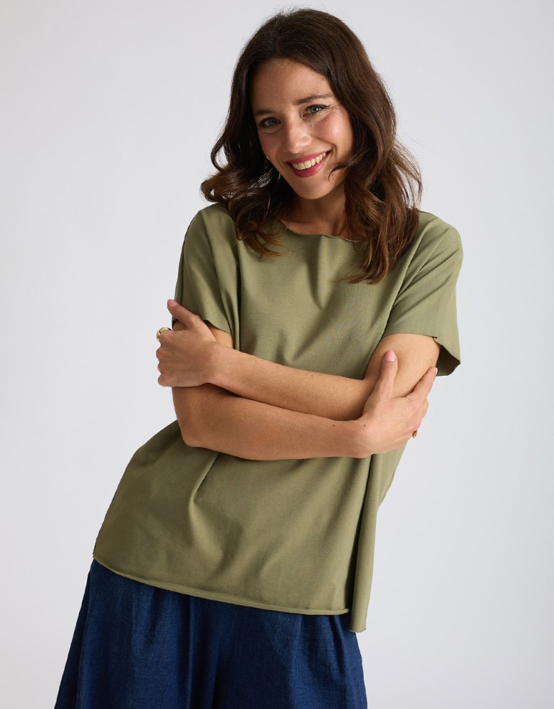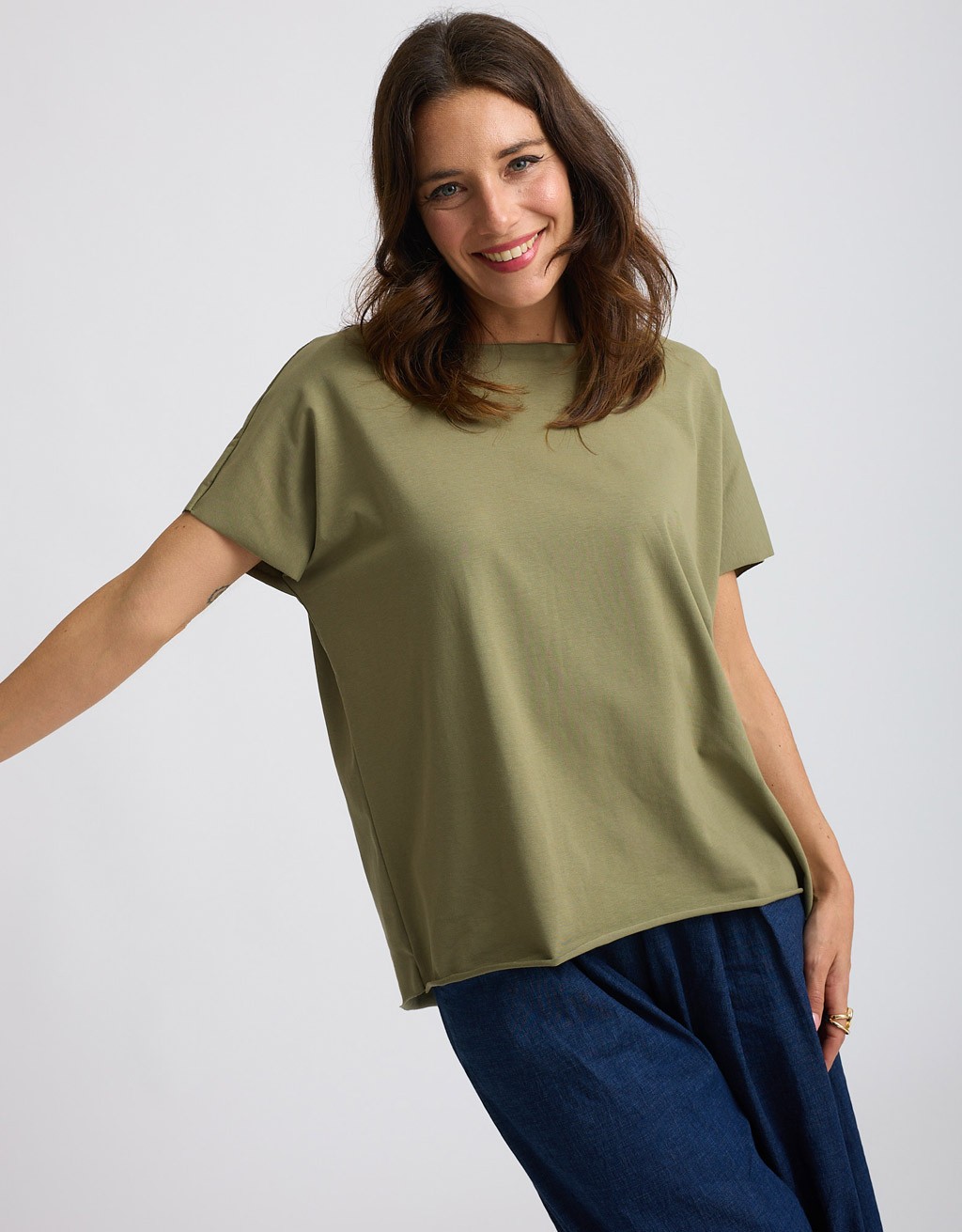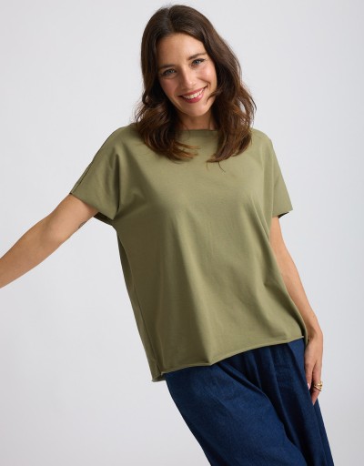 Maglietta over in cotone elasticizzato fresco e leggero, perfetta per un look casual e contemporaneo. La tinta unita versatile si abbina facilmente a qualsiasi outfit, mentre i bordi in taglio vivo aggiungono un dettaglio moderno e originale. La vestibilità ampia garantisce comfort e libertà di movimento.