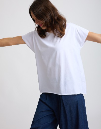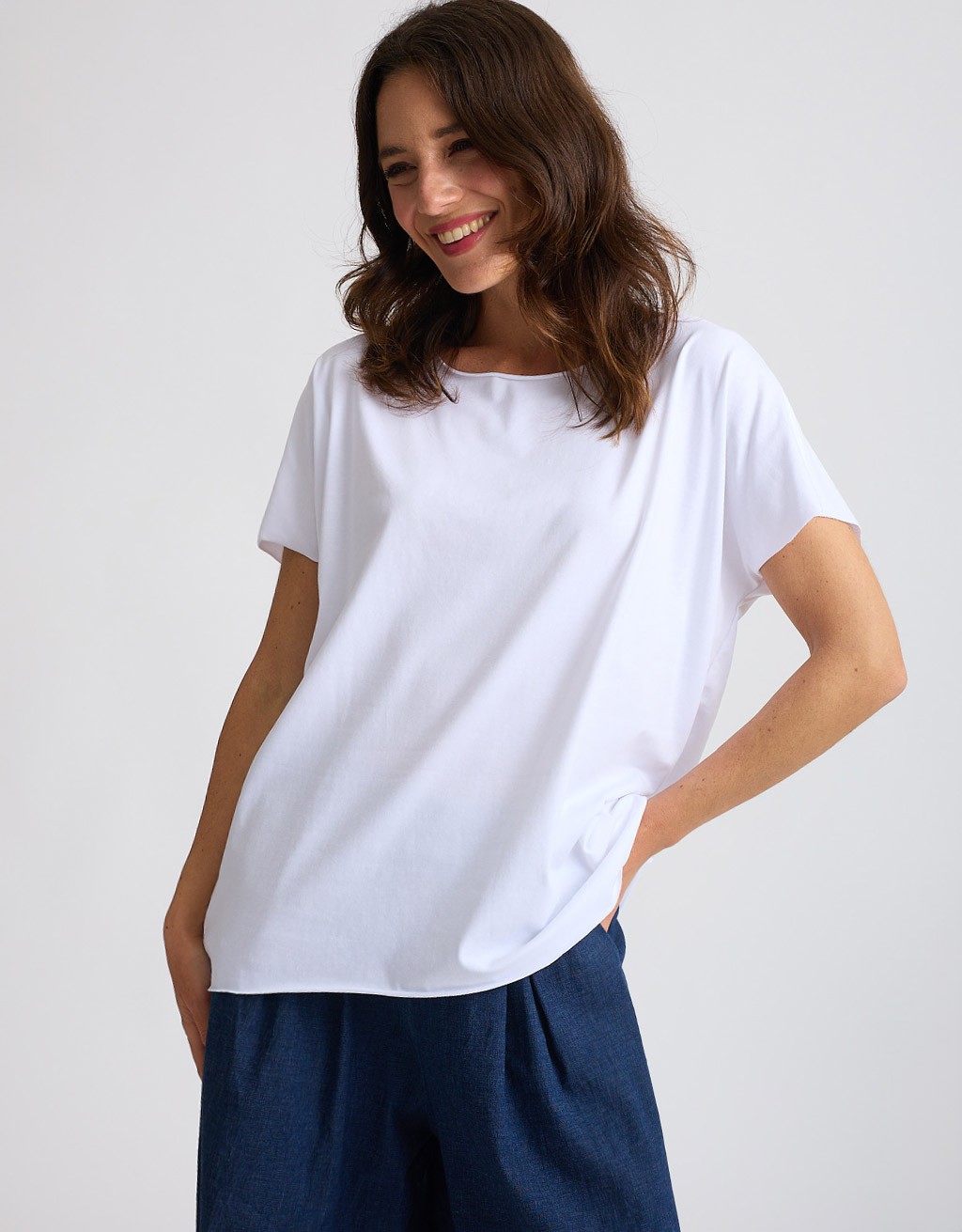 Maglietta over in cotone elasticizzato fresco e leggero, perfetta per un look casual e contemporaneo. La tinta unita versatile si abbina facilmente a qualsiasi outfit, mentre i bordi in taglio vivo aggiungono un dettaglio moderno e originale. La vestibilità ampia garantisce comfort e libertà di movimento.