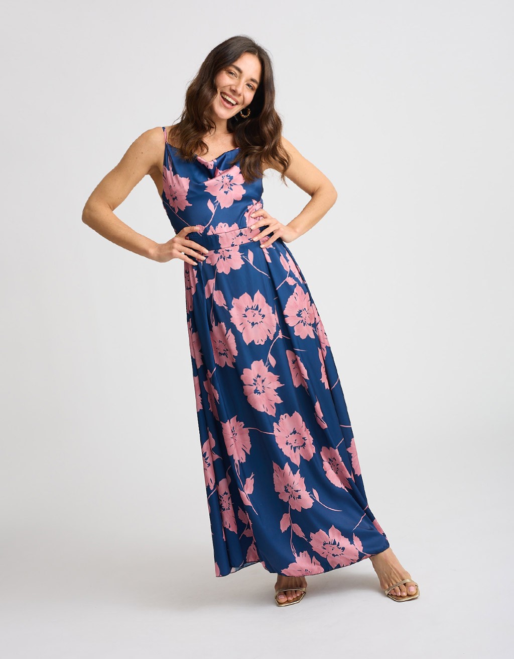 Abito lungo in raso fantasia, leggero e femminile, perfetto per le giornate e serate primaverili ed estive. Le bretelline sottili e la scollatura a gronda valorizzano il décolleté, mentre il punto smock sul retro e la cintura regolabile in vita modellano la silhouette con eleganza. Le pinces sulla gonna aggiungono movimento e raffinata fluidità.