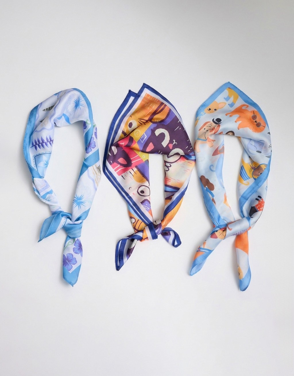 Il set è composto da tre foulard coordinati, ideali per creare abbinamenti diversi e adattarsi a look casuali. Il tessuto leggero e morbido garantisce comfort durante tutta la giornata e una vestibilità fluida che permette di annodarli facilmente.