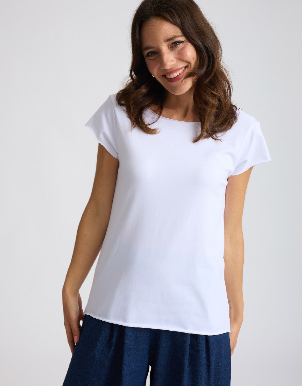 Maglietta in fresco e leggero cotone elasticizzato, dal design basico rivisitato in chiave contemporanea. I bordi a taglio vivo aggiungono un tocco grintoso e attuale, rendendola perfetta per look minimal ma di carattere. La vestibilità morbida la rende ideale da indossare ogni giorno con semplicità e stile.