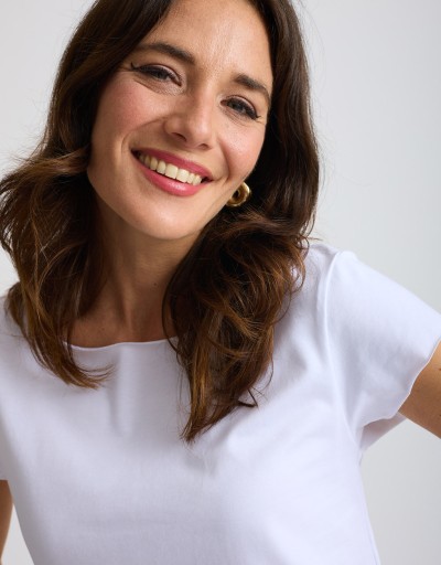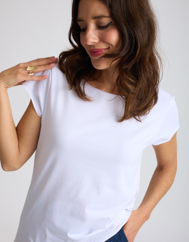 Maglietta in fresco e leggero cotone elasticizzato, dal design basico rivisitato in chiave contemporanea. I bordi a taglio vivo aggiungono un tocco grintoso e attuale, rendendola perfetta per look minimal ma di carattere. La vestibilità morbida la rende ideale da indossare ogni giorno con semplicità e stile.