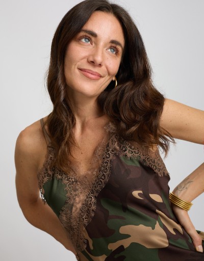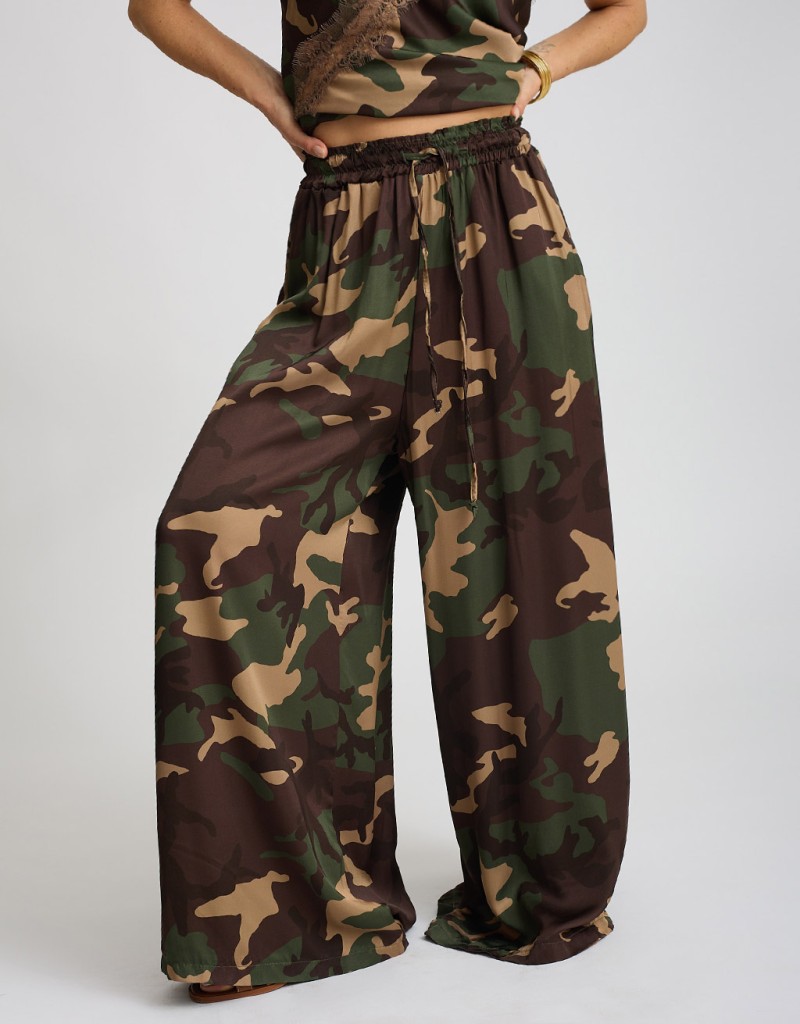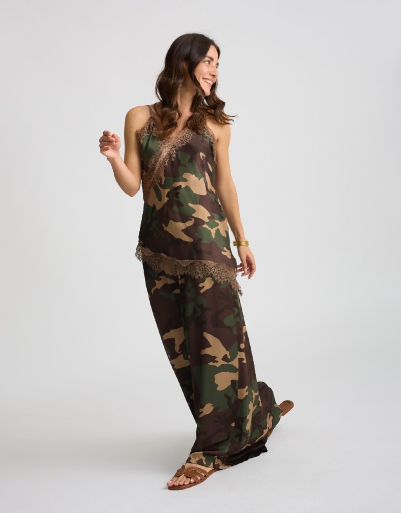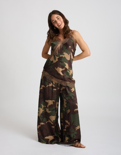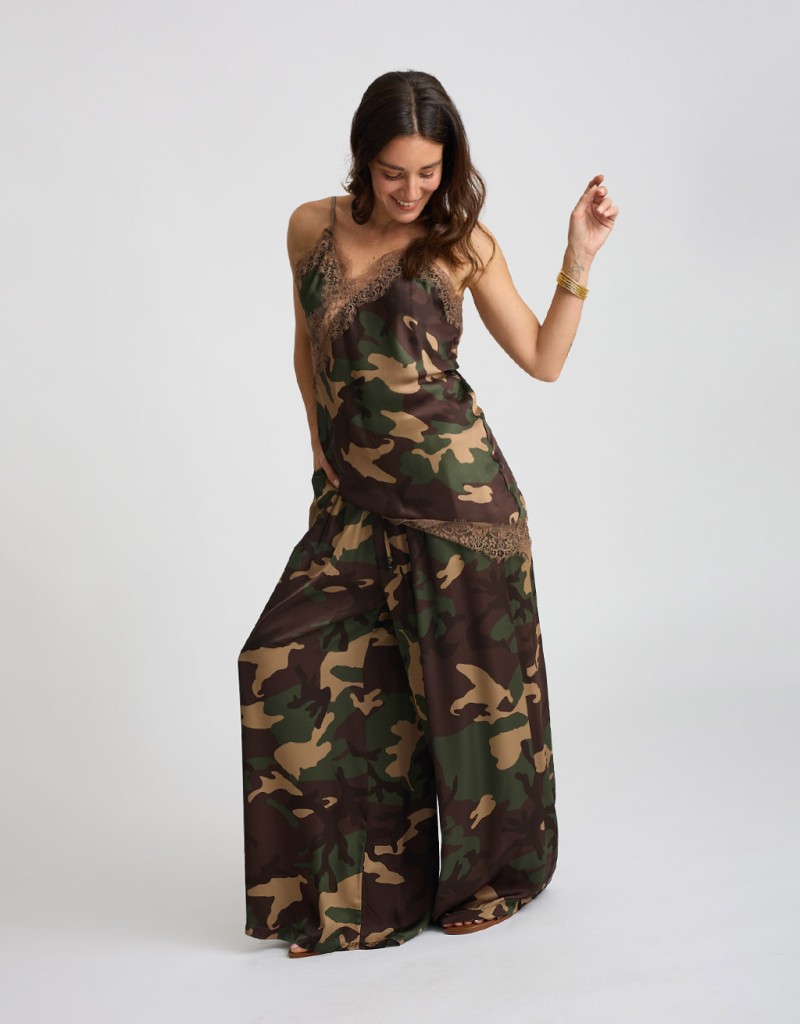 Deciso e super contemporaneo, questo completo in raso fantasia camouflage unisce carattere e femminilità. Il top con bretelline regolabili, scollo a V e fondo diagonale è rifinito da delicati inserti in pizzo, mentre il pantalone palazzo cade fluido accompagnando i movimenti. Un coordinato d’impatto, perfetto per distinguersi con stile.