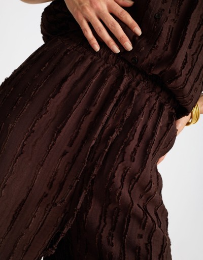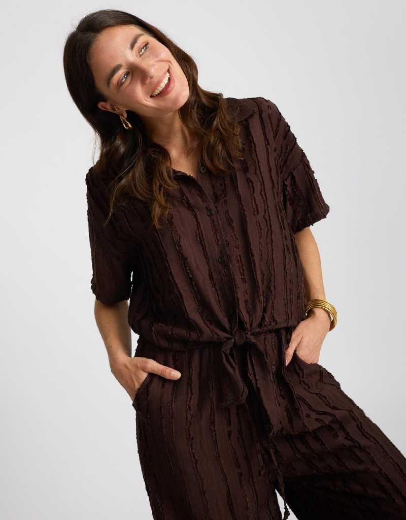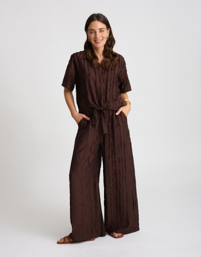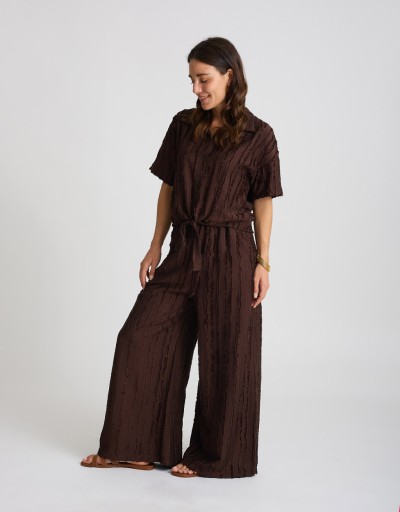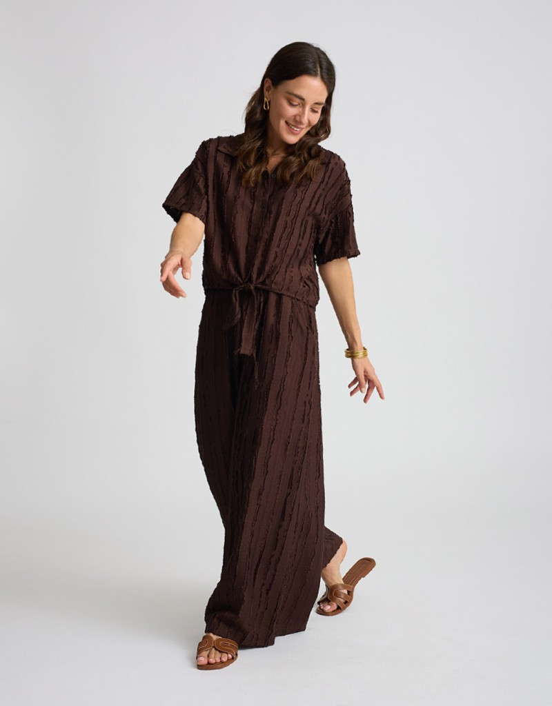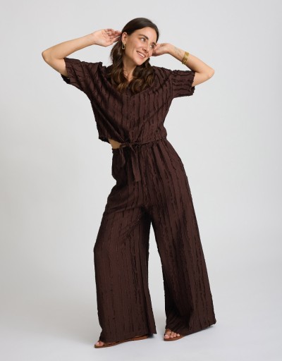 Fresco, leggero e dal mood disinvolto: questo completo in misto viscosa è perfetto per la bella stagione. La camicia crop con nodo valorizza il punto vita, mentre il pantalone palazzo scivola morbido donando movimento. Le righe sfrangiate aggiungono un tocco dinamico e originale, per un look rilassato ma sempre curato.