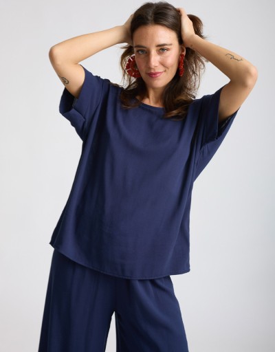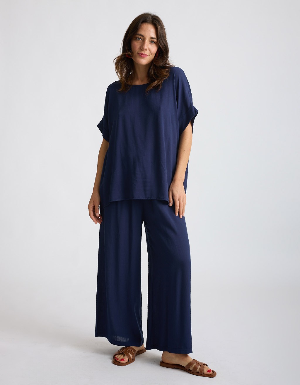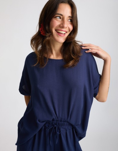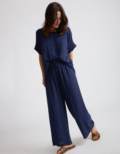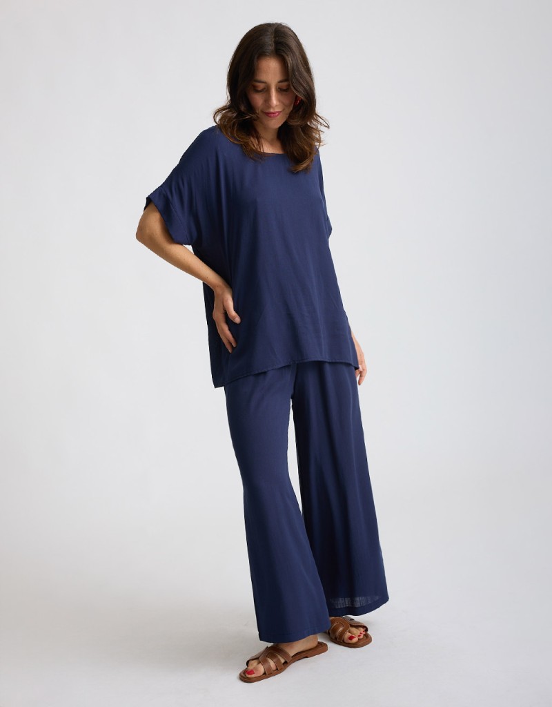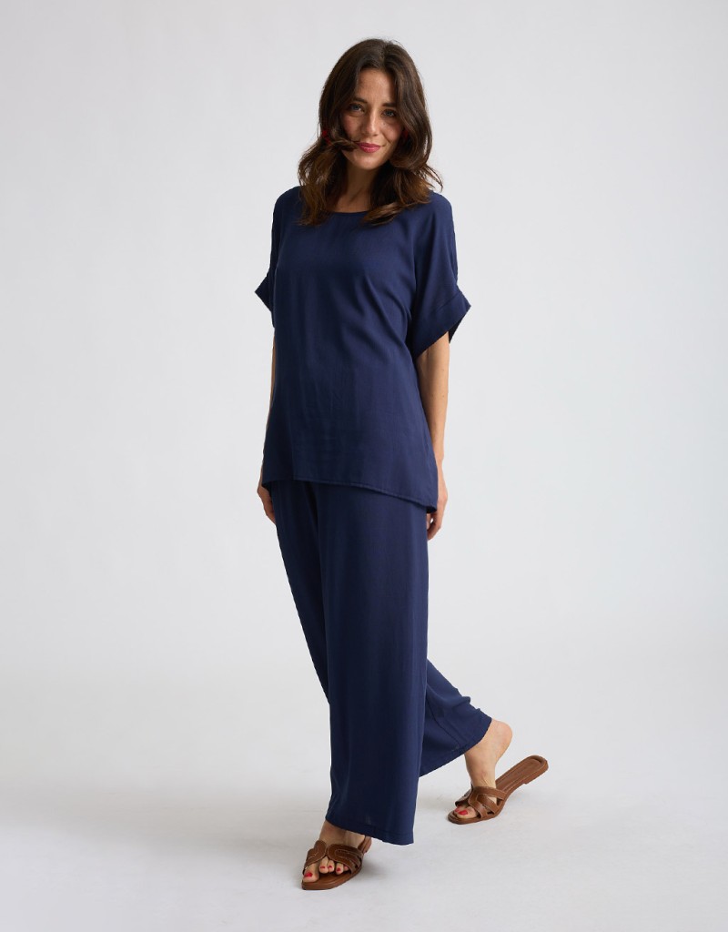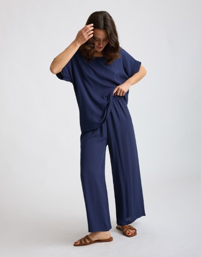 Completo in viscosa fresca e leggera con tramatura effetto lino. La camicetta over a manica corta con scollatura a giro dona un’allure minimal e sofisticata, mentre il pantalone a palazzo con elastico in vita assicura comfort e vestibilità fluida. Un set perfetto per le giornate estive in città o le occasioni informali chic.