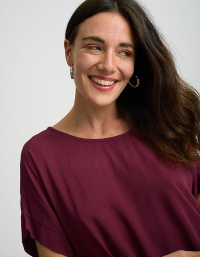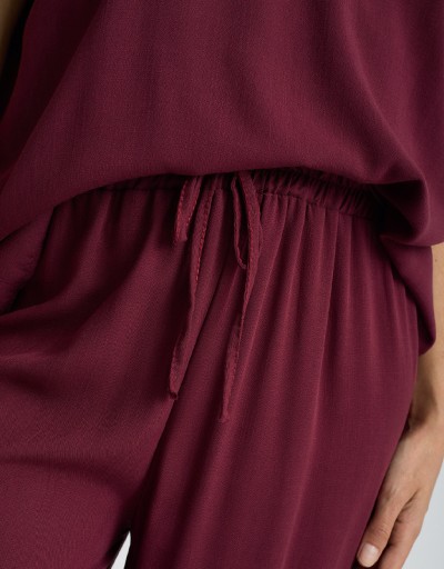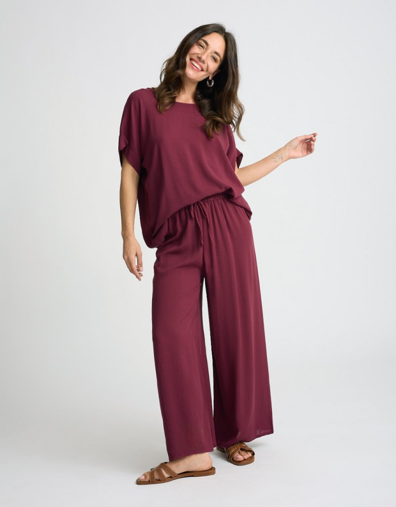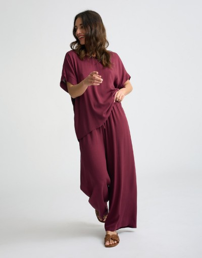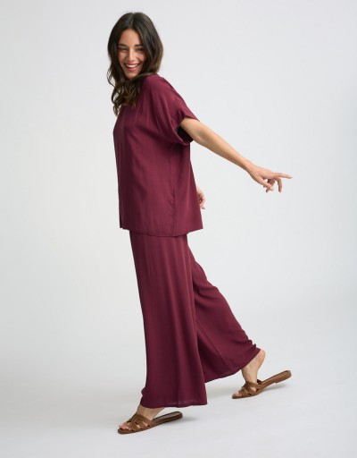 Completo in viscosa fresca e leggera con tramatura effetto lino. La camicetta over a manica corta con scollatura a giro dona un’allure minimal e sofisticata, mentre il pantalone a palazzo con elastico in vita assicura comfort e vestibilità fluida. Un set perfetto per le giornate estive in città o le occasioni informali chic.
